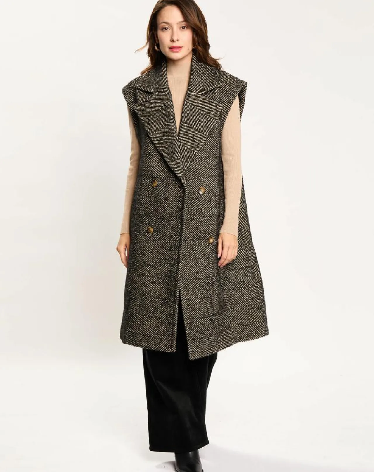 Veste longue sans manches en chevron avec double boutonnage, avec col tailleur, assez droit