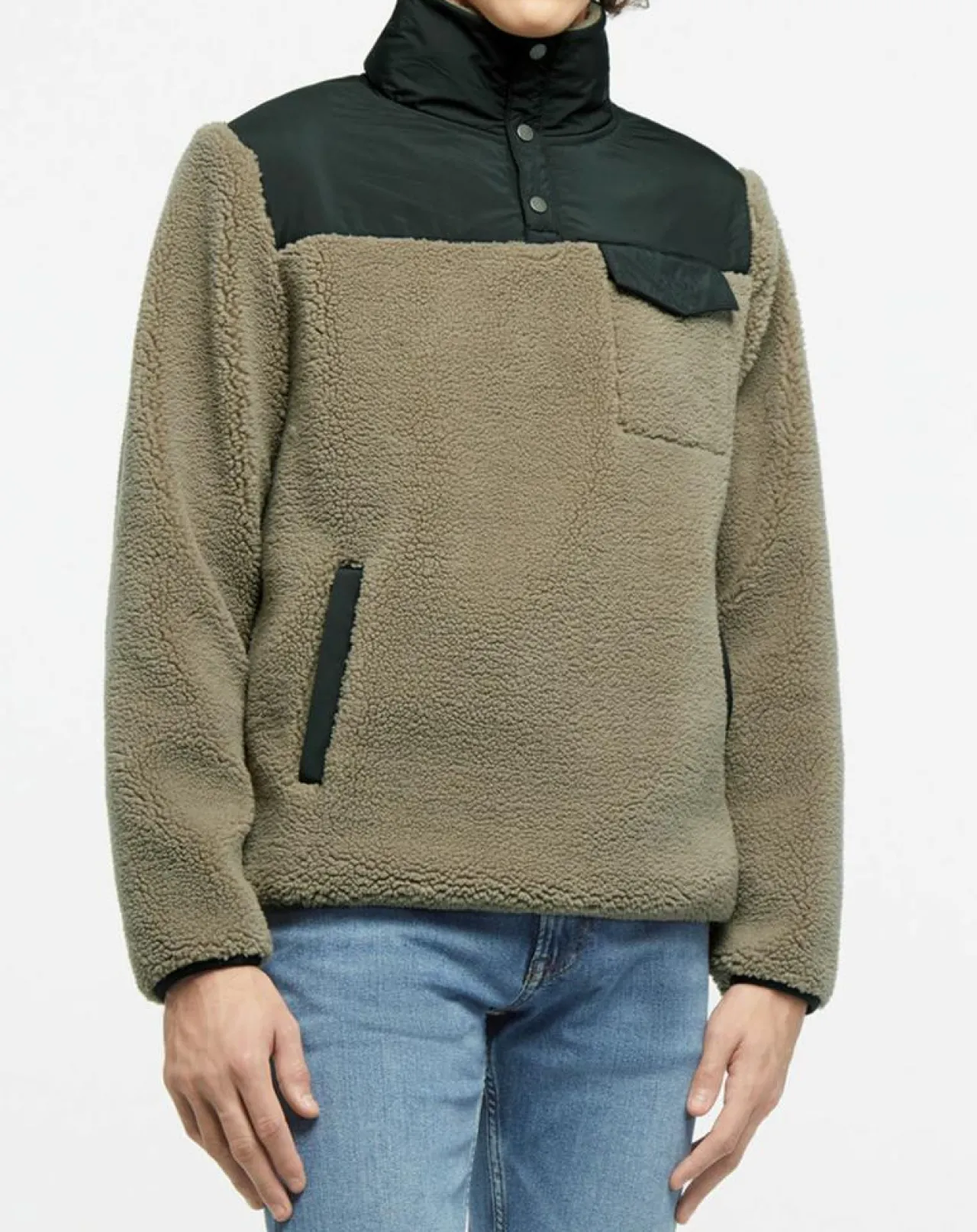 Cette vareuse droite Gant bi matière, effet peau lainée et tissu lisse, présente un col montant, une fermeture à boutons pression, une poche poitrine à rabat pressionné et 2 poches ouvertes.