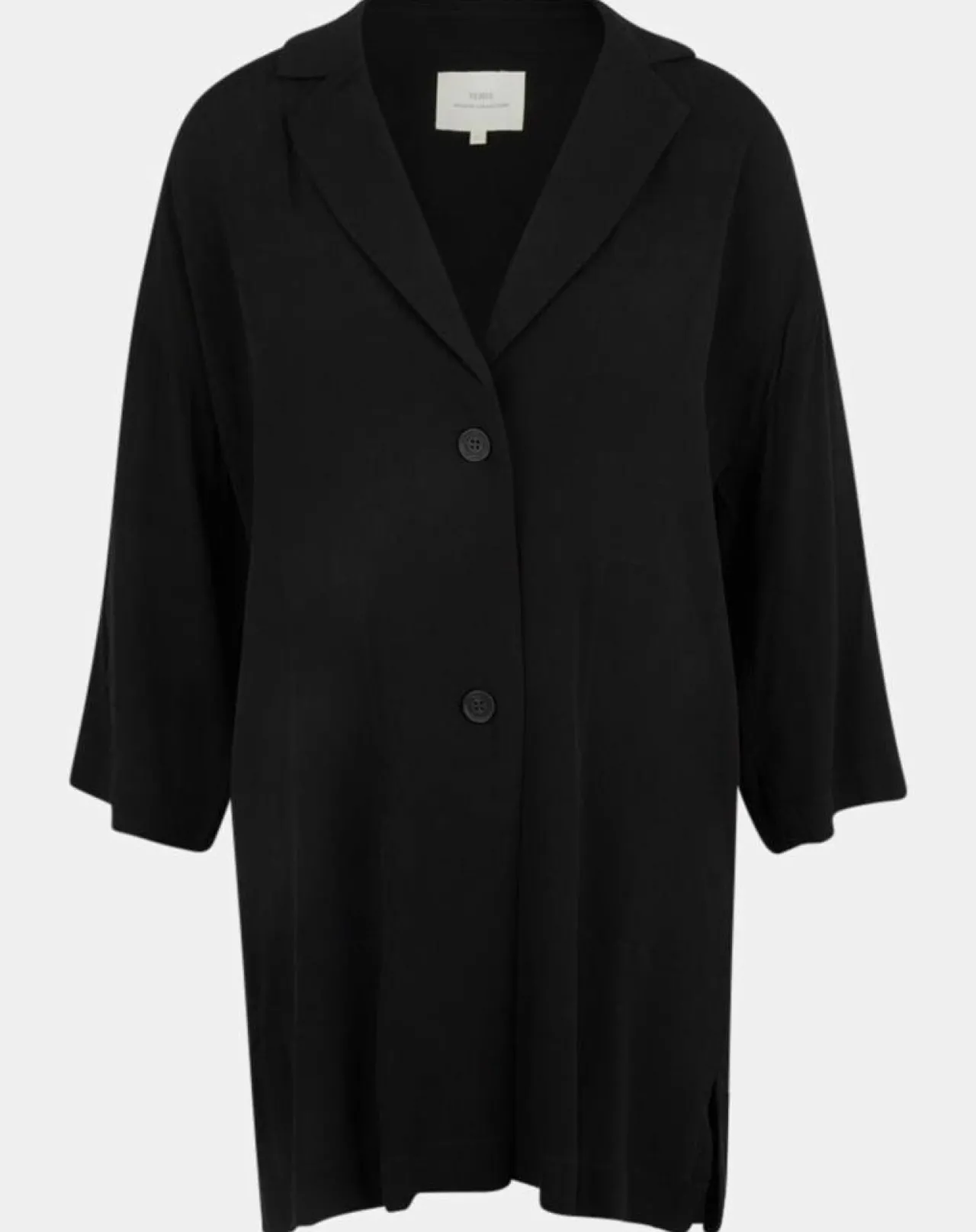Cette veste longue fluide Yerse est munie d’un col tailleur, d’une fermeture boutonnée, de manches 3/4 et de poches.