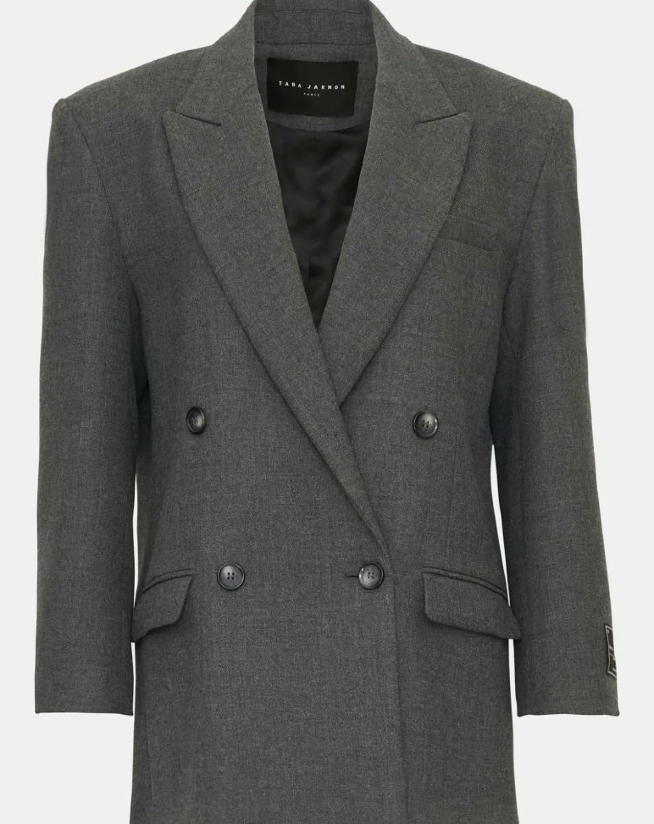 Cette veste de tailleur gris anthracite confectionnée en toile possède une coupe droite masculine oversized avec de larges épaule et un double boutonnage de boutons ton sur ton