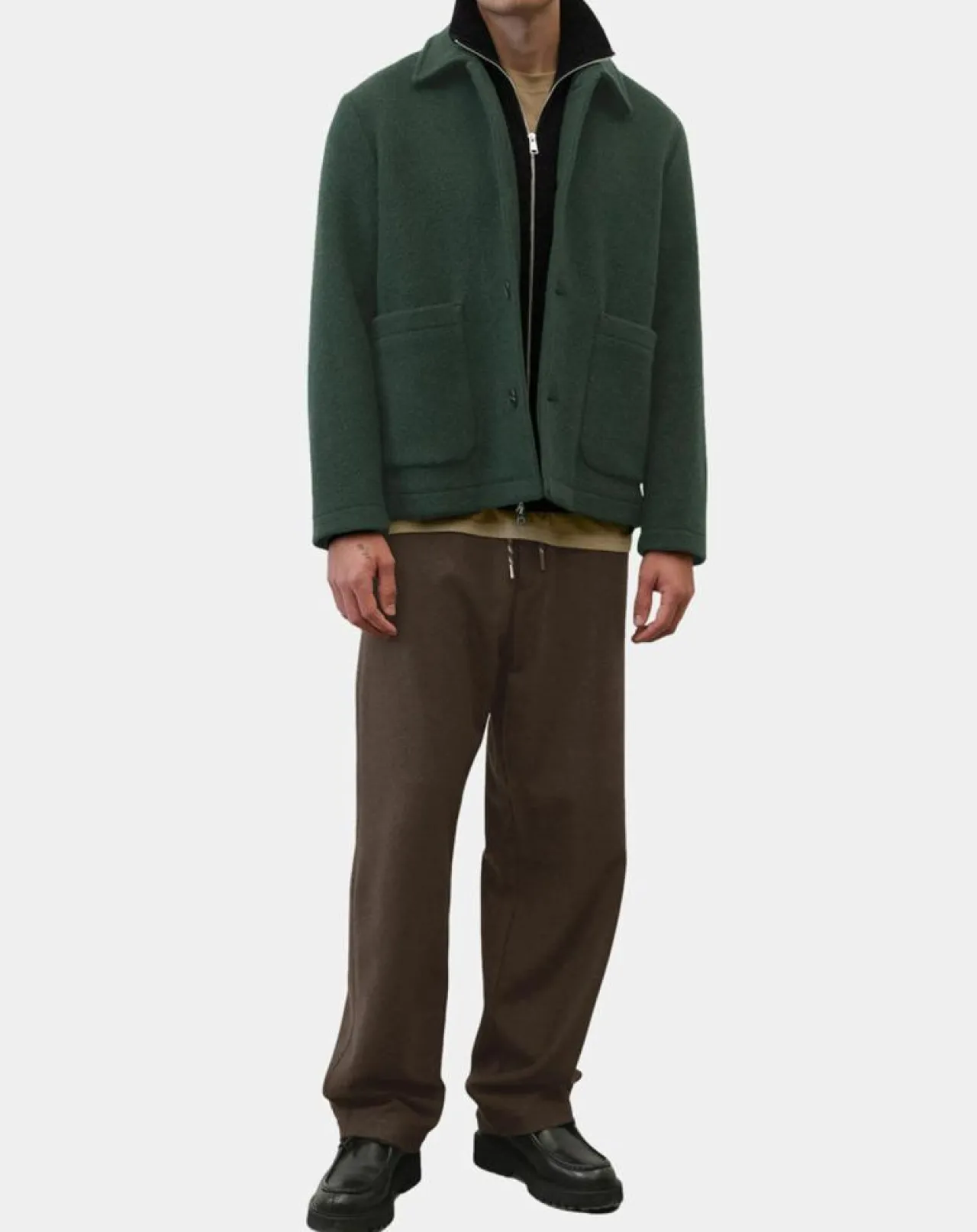 Il présente une coupe moderne et décontractée en O, un col à rabattre, une patte de boutonnage sur toute la longueur à boutons d’aspect corne, des poches plaquées sur les côtés et une base droite.