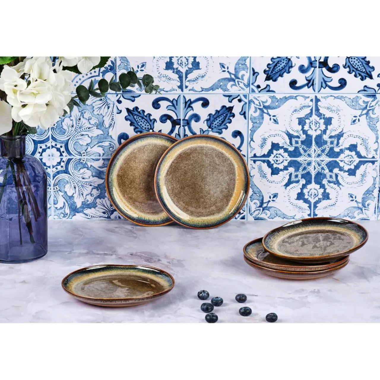 Après une première cuisson de l’argile à basse température, des émaux réactifs de couleurs différentes s’appliquent sur le grès et lui donnent un relief unique et éclatant. L’apparition de nuances de teintes que l’on retrouve d’une pièce à l’autre est le résultat d’un savant mélange artisanal des techniques de cuisson et du mode d’application de l’émail.