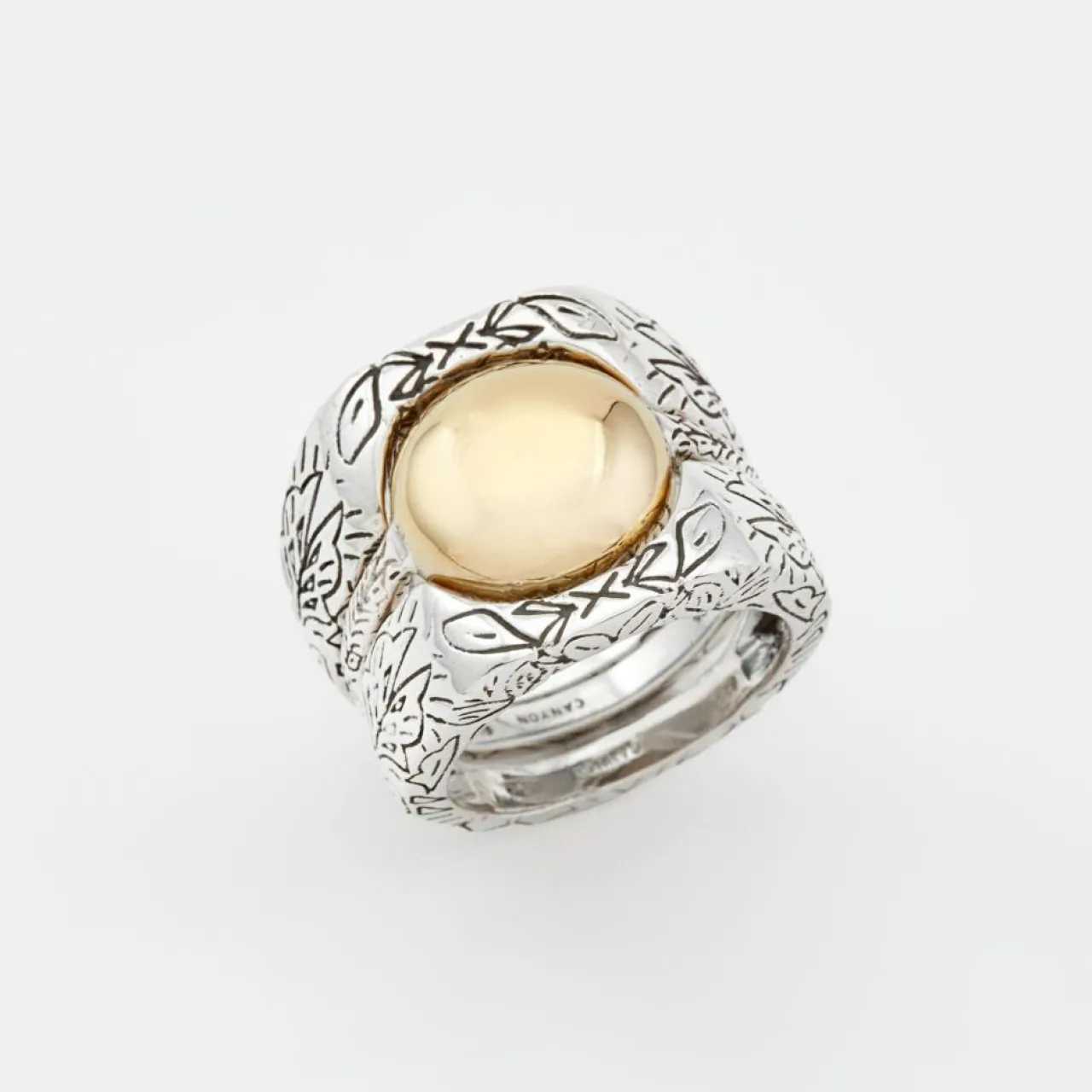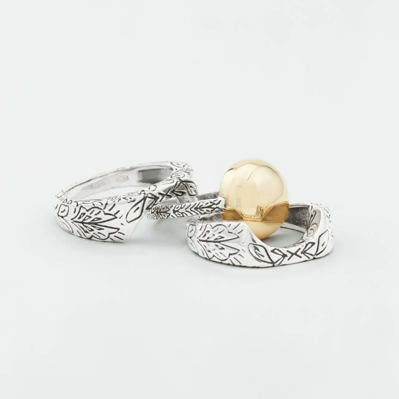 Bague en argent triple grand modéle composée en son centre d’un rond de laiton et d’un anneau argent vieilli travaillé entouré par 2 anneaux en argent vieilli travaillé s’imbriquant de chaque coté