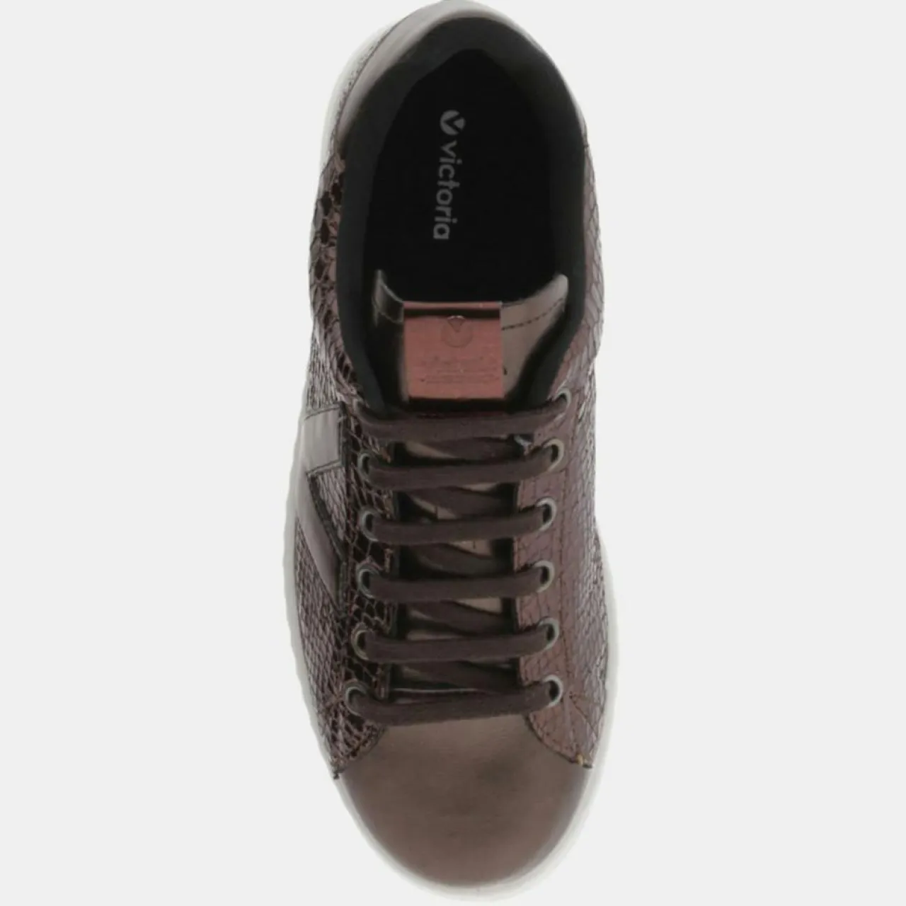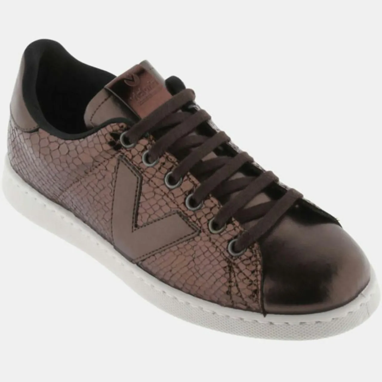 Ces baskets basses Victoria en matière enduite vernis embossée serpent, sont dotées d’un bout arrondi, d’un laçage à 7 oeillets et d’une languette siglée.