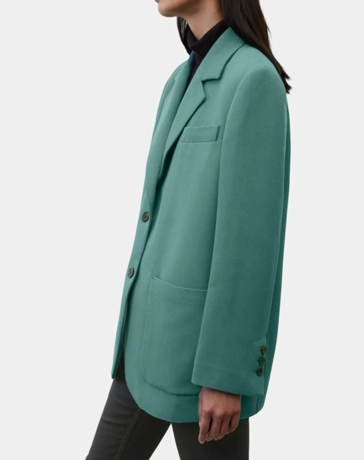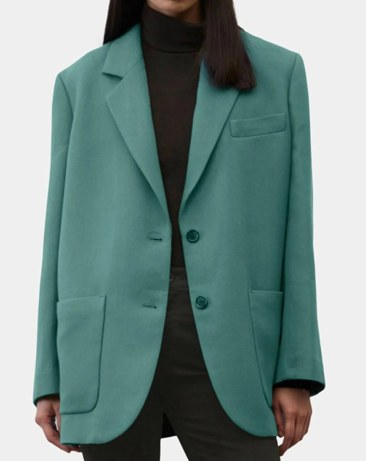 Boutonnage droit classique à revers tombant, deux boutons, une poche-poitrine, deux grandes poches plaquées, un bord piqué arrondi et une fente au milieu du dos.