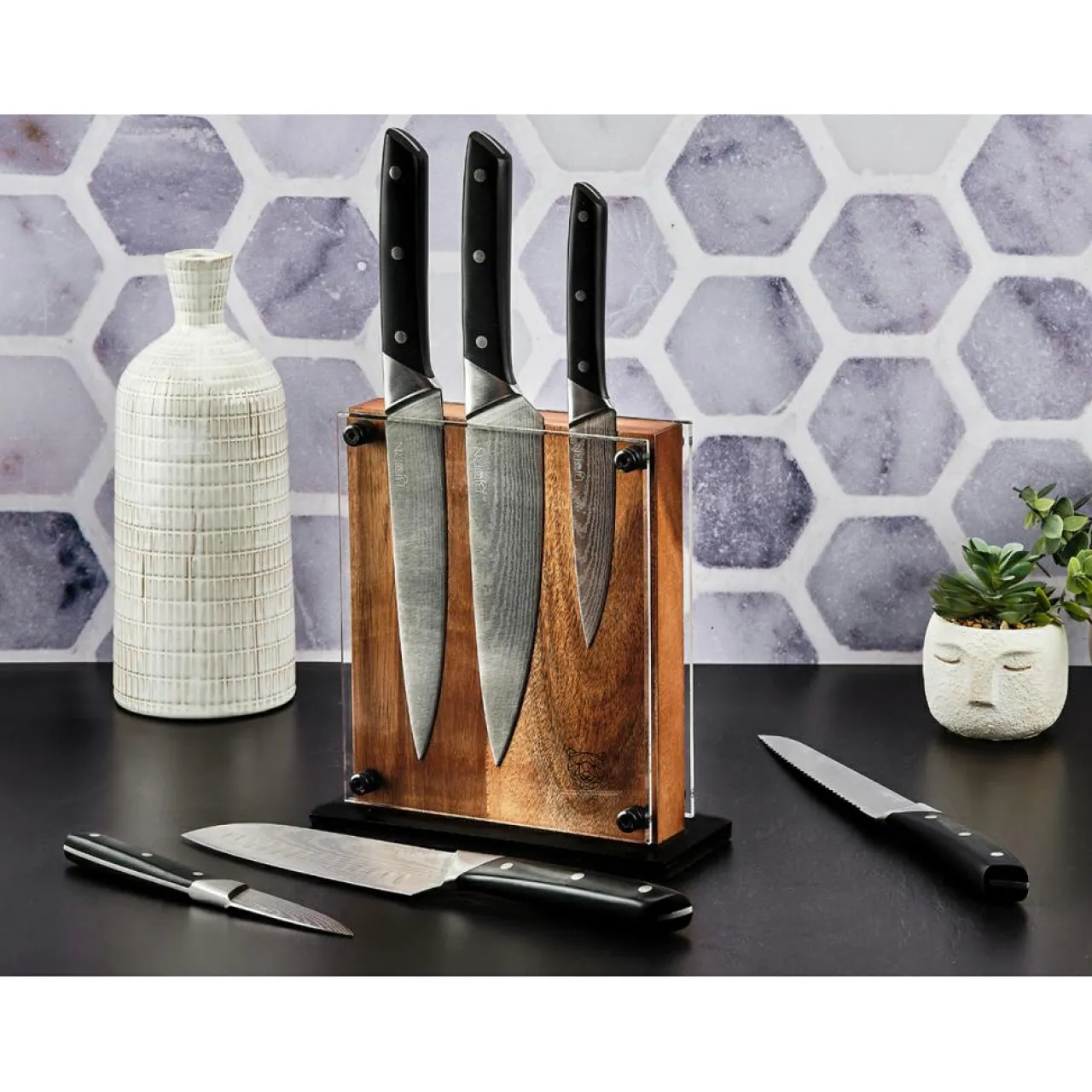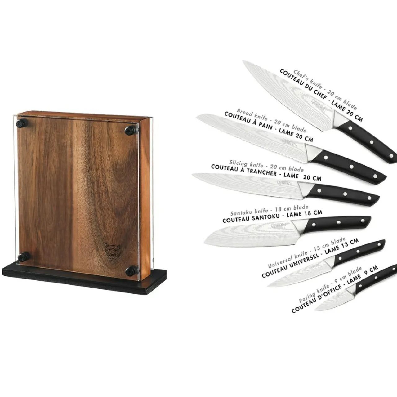 – Fabriqué en acier inoxydable finition satinée effet damas et poignée ABS (couteaux) – bois d’acacia (bloc)