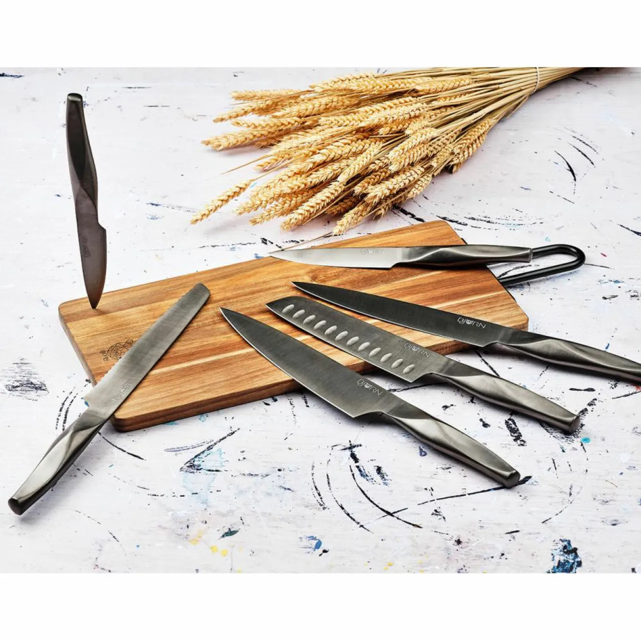 Adapté pour un lavage au lave-vaisselle, le set se compose d’un couteau d’office pour couper et peler, d’un couteau universel très polyvalent, d’un couteau santoku pour les herbes aromatiques, les fruits et les légumes (les aliments ne restent pas collés à la lame grâce aux alvéoles), d’un couteau à trancher pour couper les viandes sans les déchirer, d’un couteau à pain permettant de découper des tranches nettes sans en abîmer la croûte et d’un couteau du chef pour les fruits, légumes, viandes ou poissons