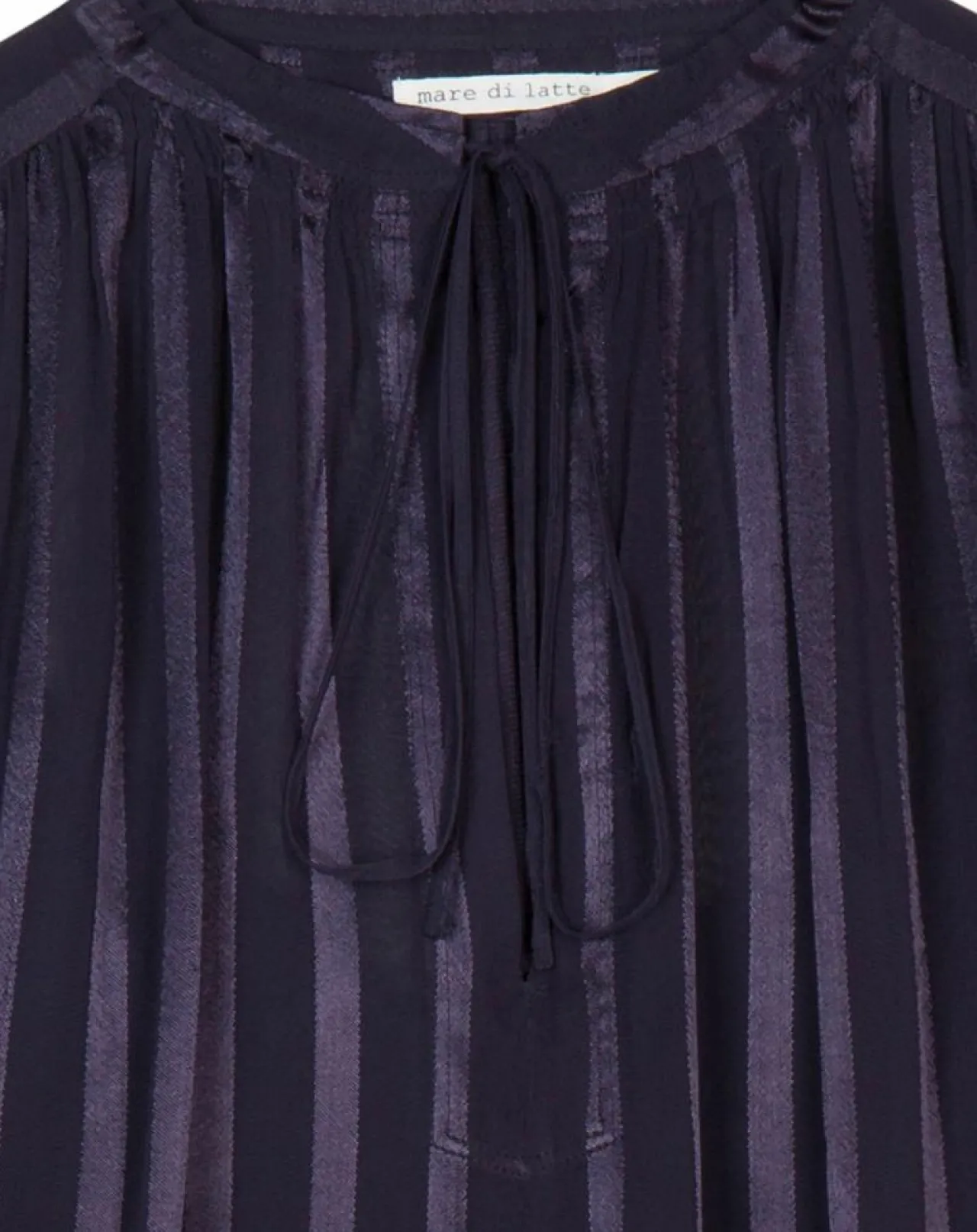 Notre blouse Elene, confectionnée dans une mousseline à rayures satinées, se ferme à l’encolure par un ruban délicat