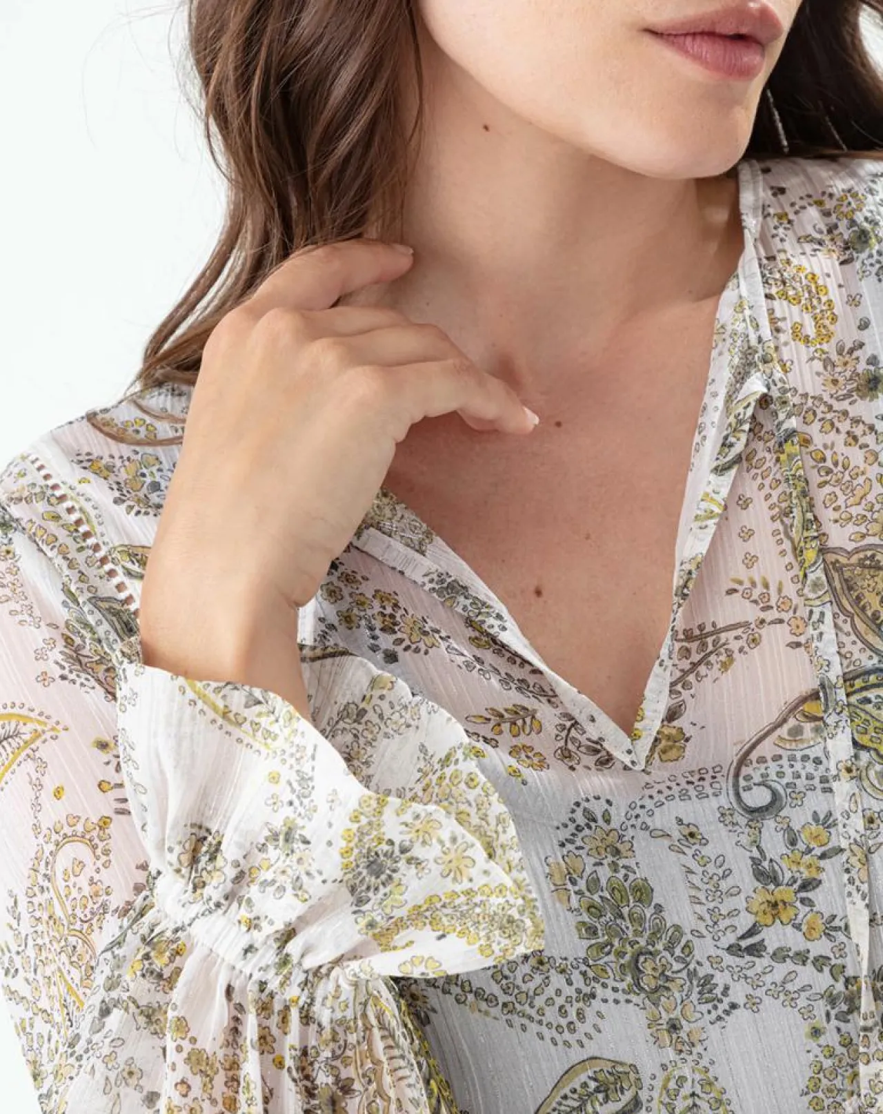 Adoptez la blouse manches longues JHALAK et son imprimé cachemire argenté qui évoque douceur et légèreté