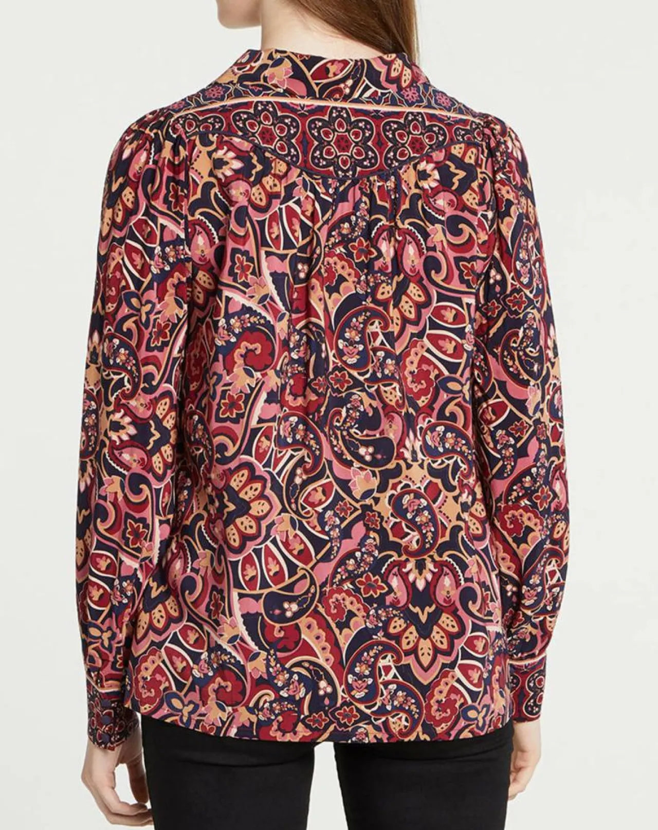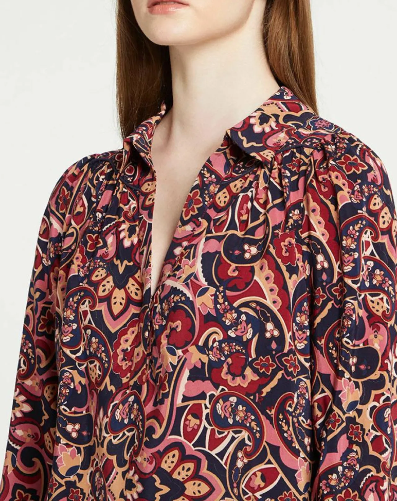 Cette blouse droite fluide fantaisie Suncoo est dotée d’un col classique suivi d’un décolleté V, de manches longues et de poignets resserrés.