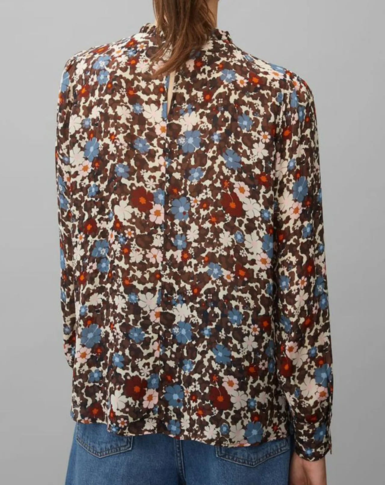 Modèle doté d’un col froncé à ruches et fermeture haute et de manches bouffantes sobres à poignets.