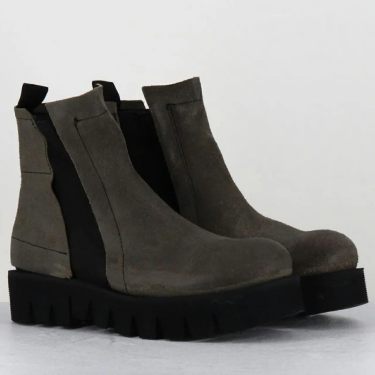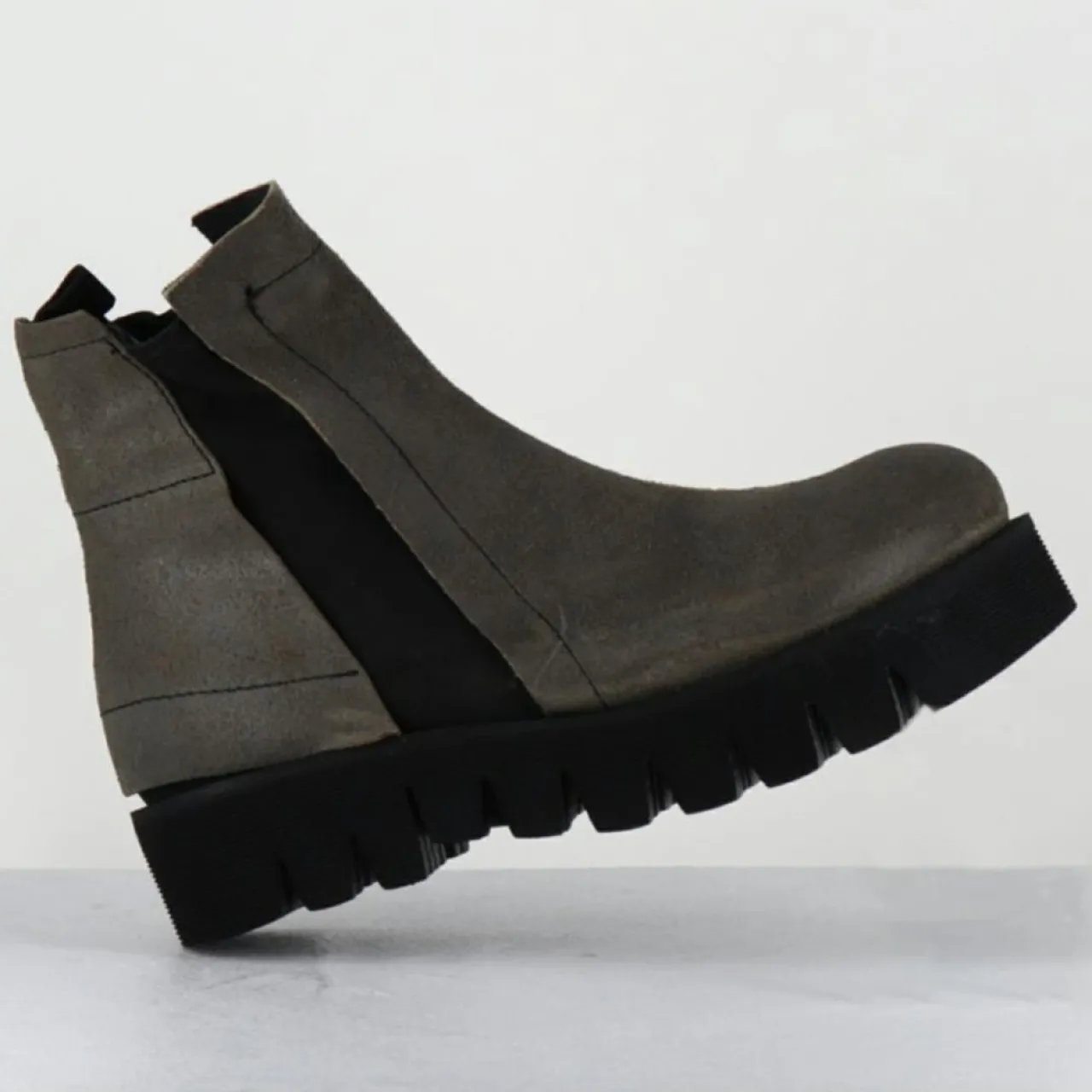 Boots courtes en cuir nubuck gris taupe huilé et brossé pour un effet vieilli
