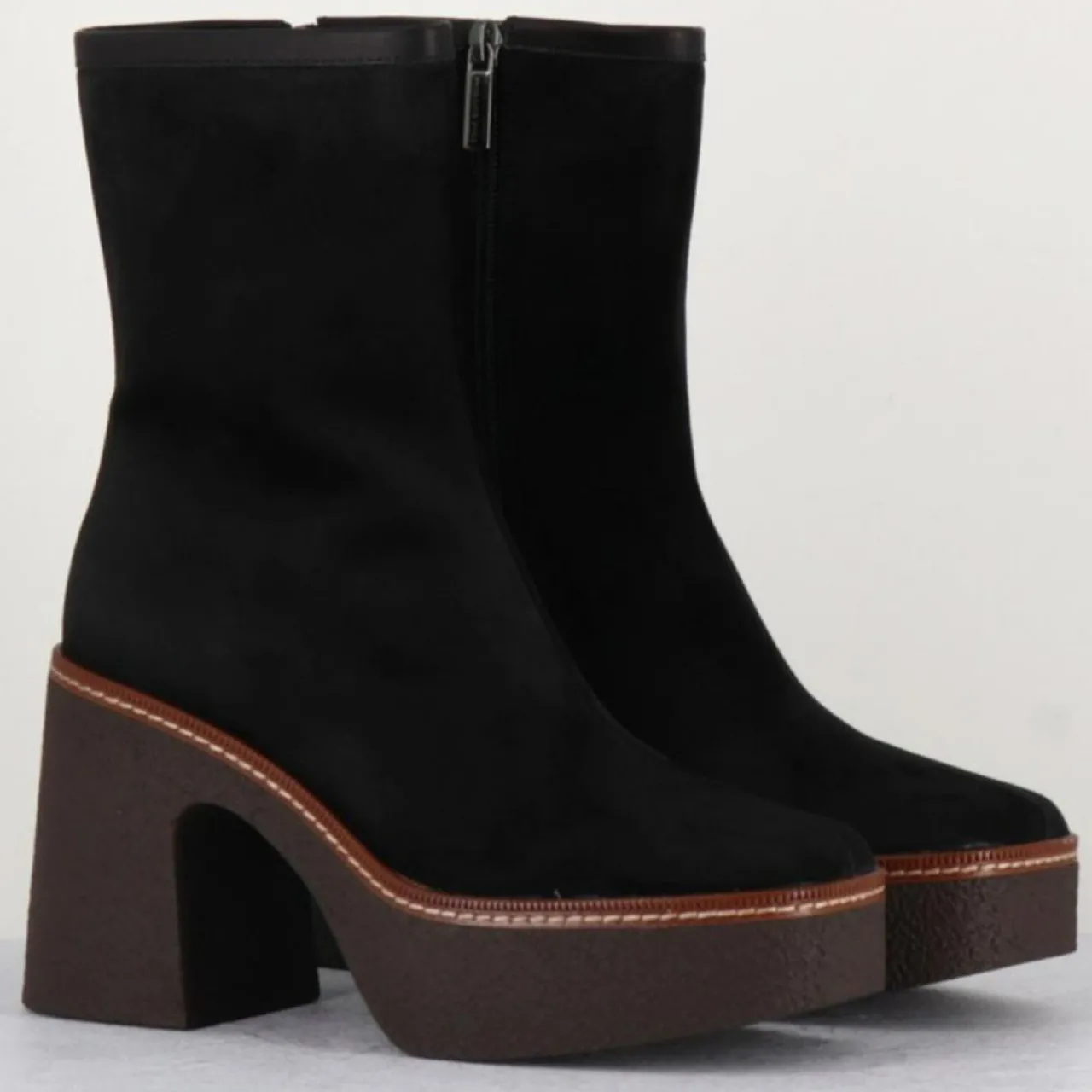 Boots en daim noir, bout carré, couture centrale et montées sur un talon chunky & plateforme en crêpe. Fabrication artisanale espagnole.
