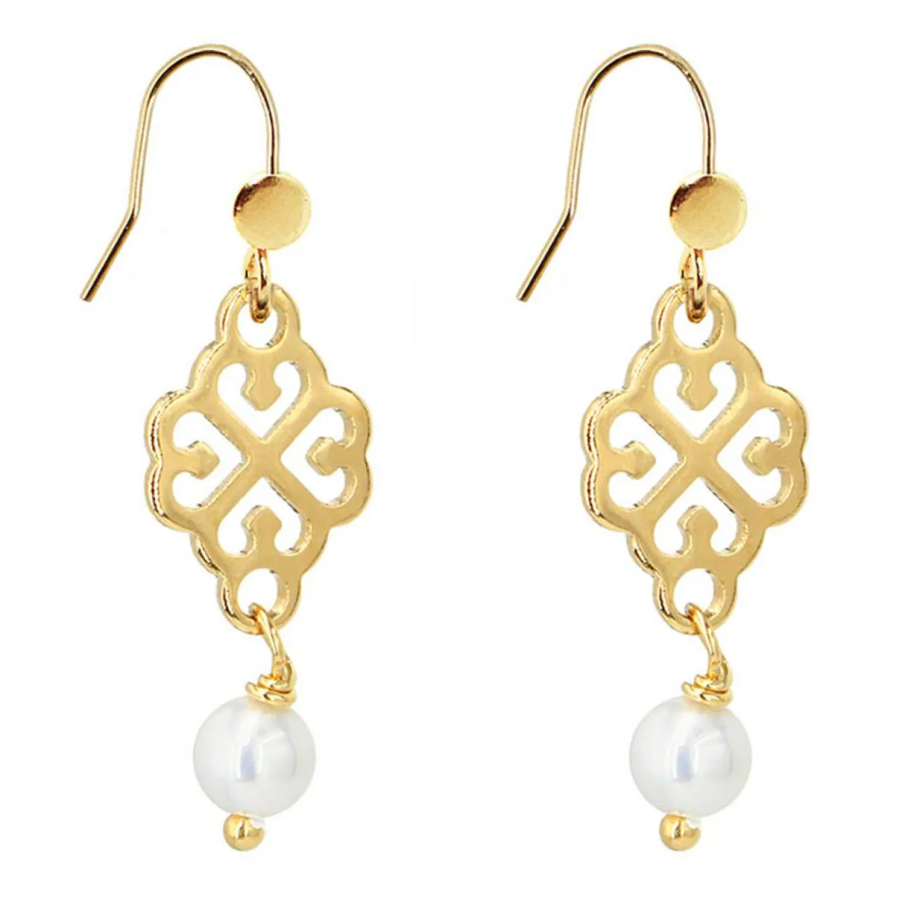 Ravissantes boucles d’oreilles dormeuses avec leurs petites arabesques et perles d’eau douce blanches