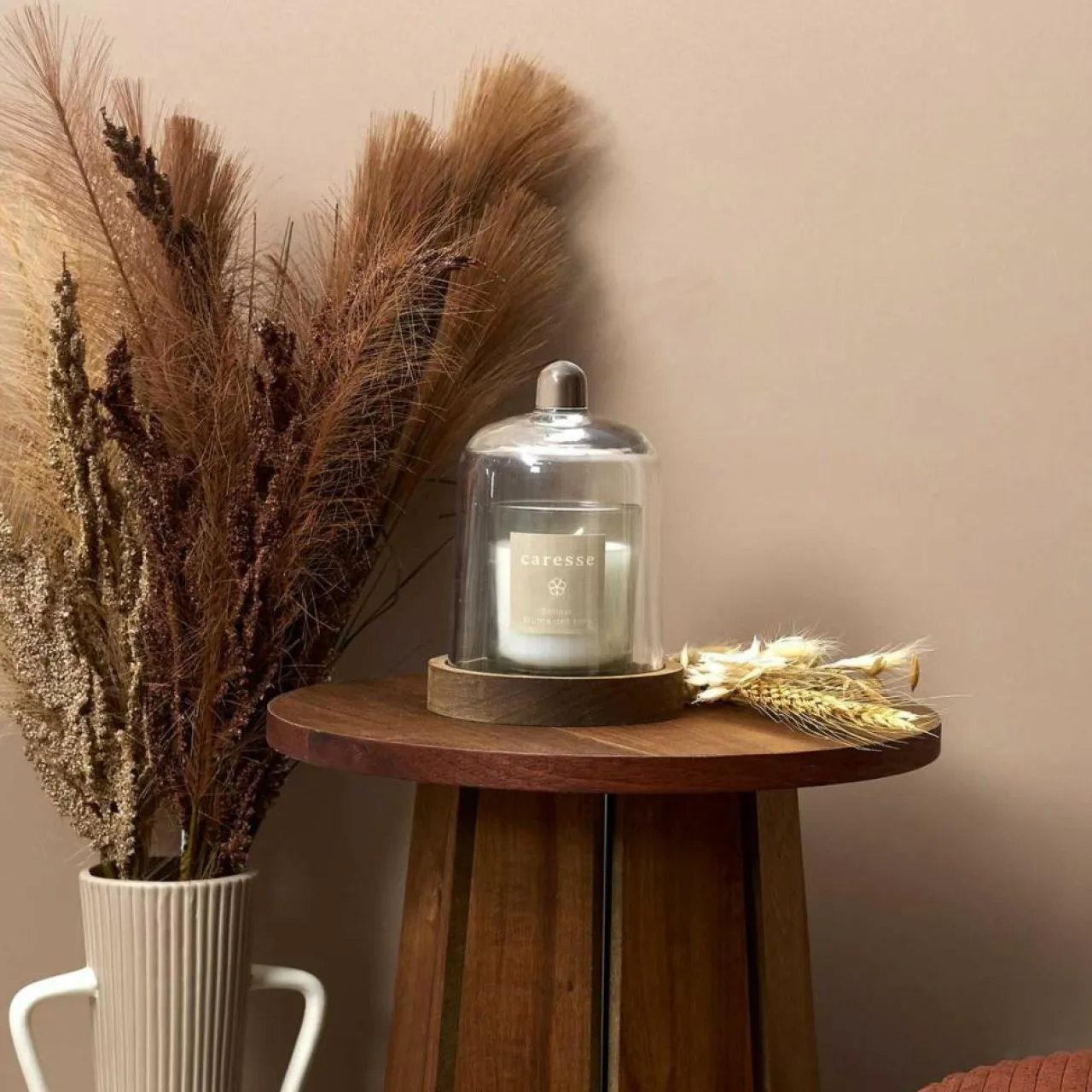 La cloche en verre ajoute une touche d’élégance tout en protégeant la bougie pour préserver son parfum