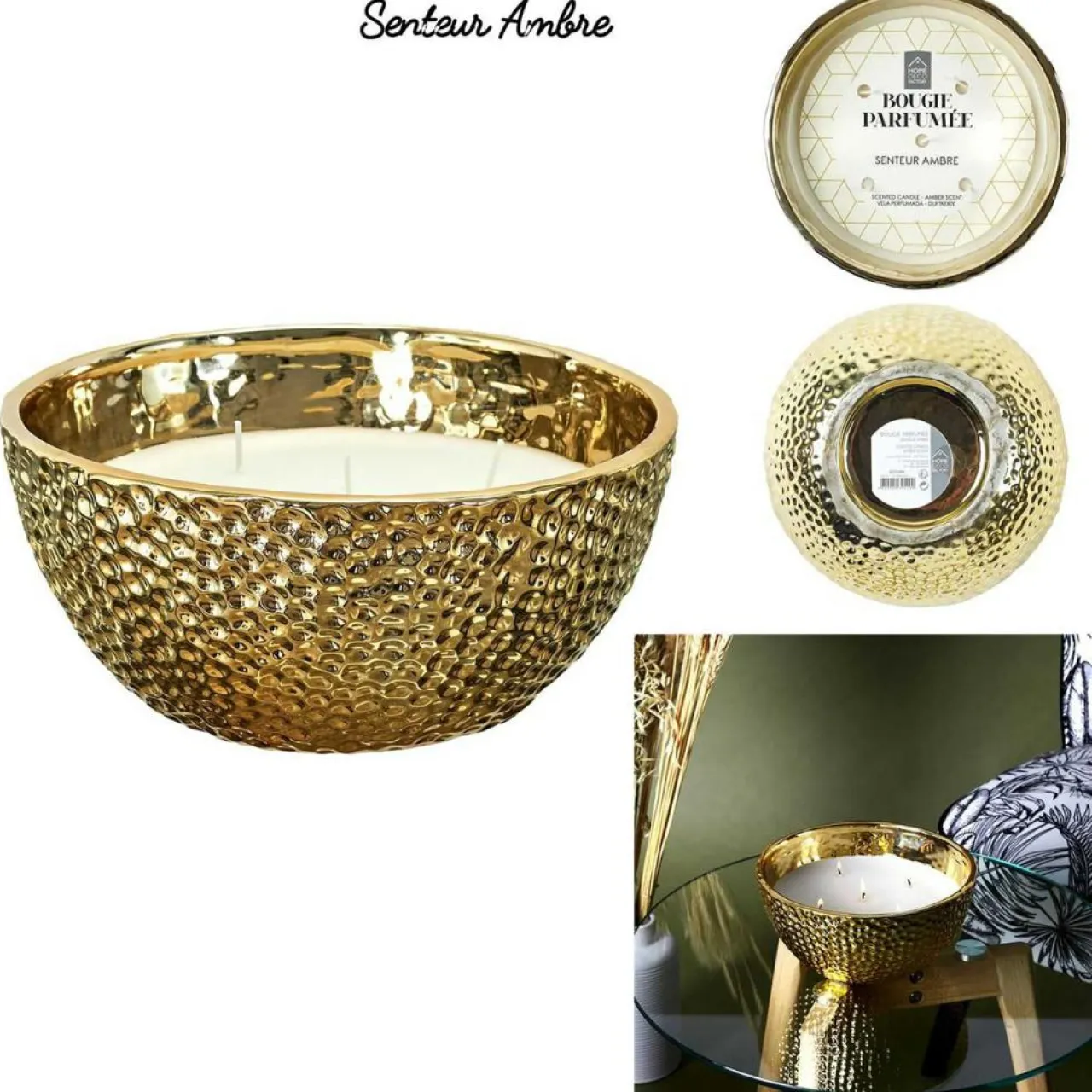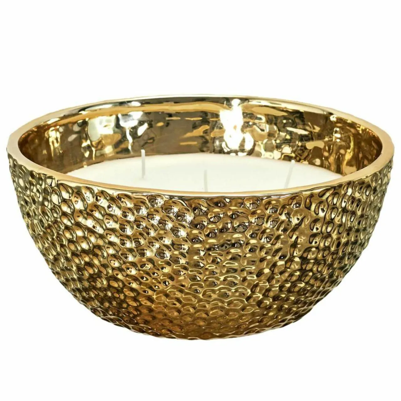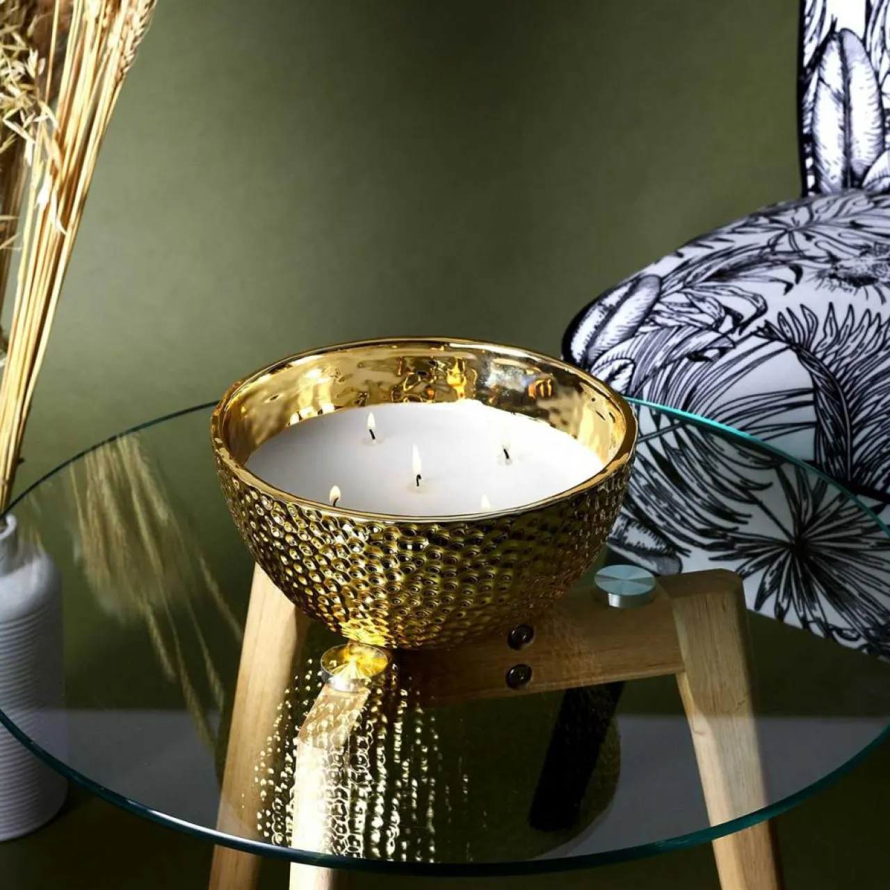 Ajoutez une note de charme à votre intérieur avec cette bougie parfumée au design martelé doré