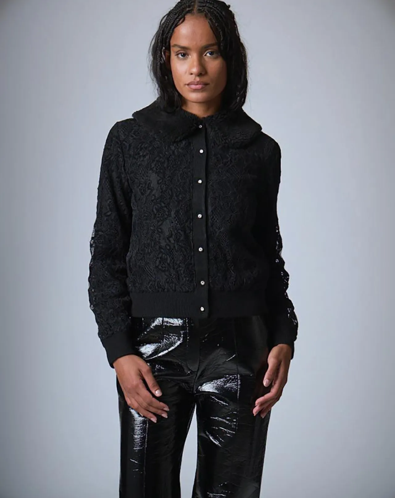 Cardigan en maille doublé d’un voile dentelle, boutons bijoux sur le devant et col en fausse fourrure.