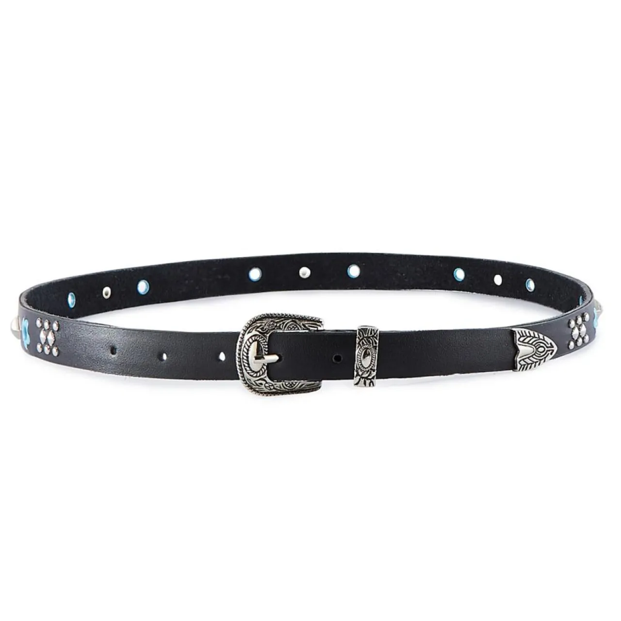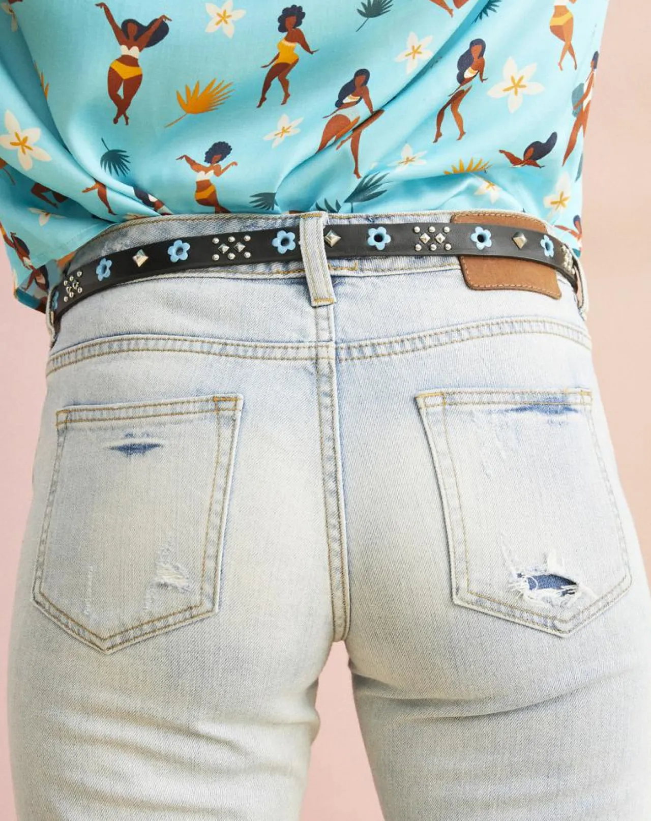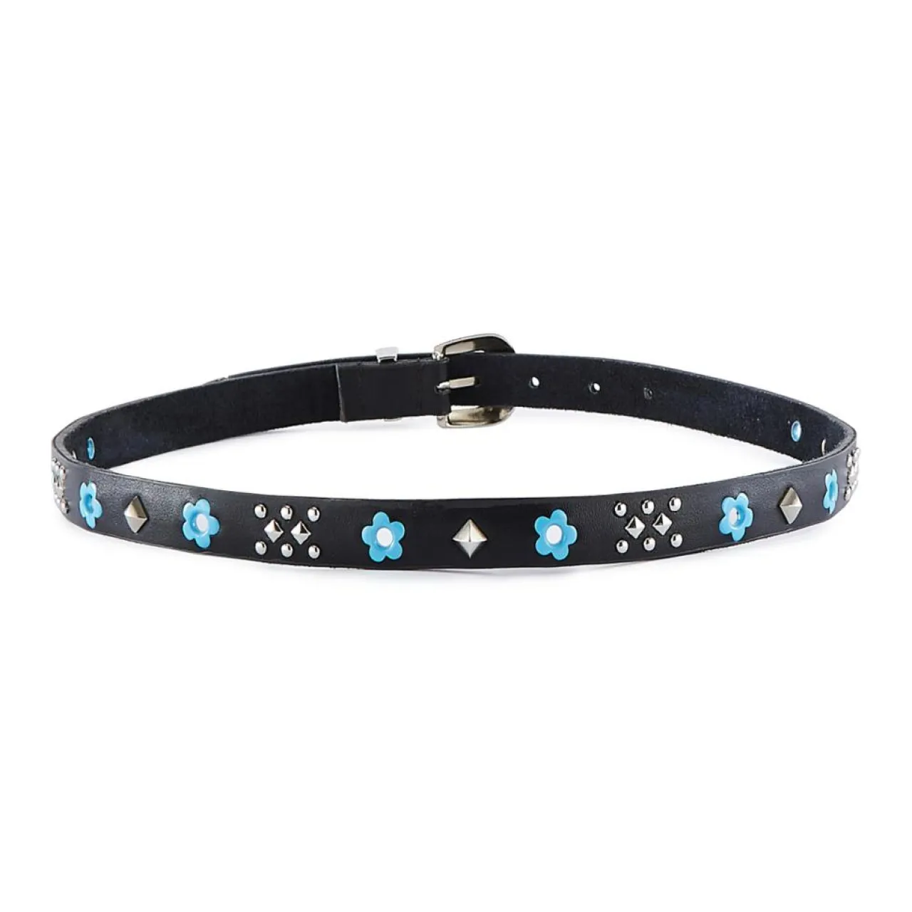Ceinture fine en cuir noir, décorée de fleurs colorées en oeillets alternées avec des clous argentés en forme de diamants