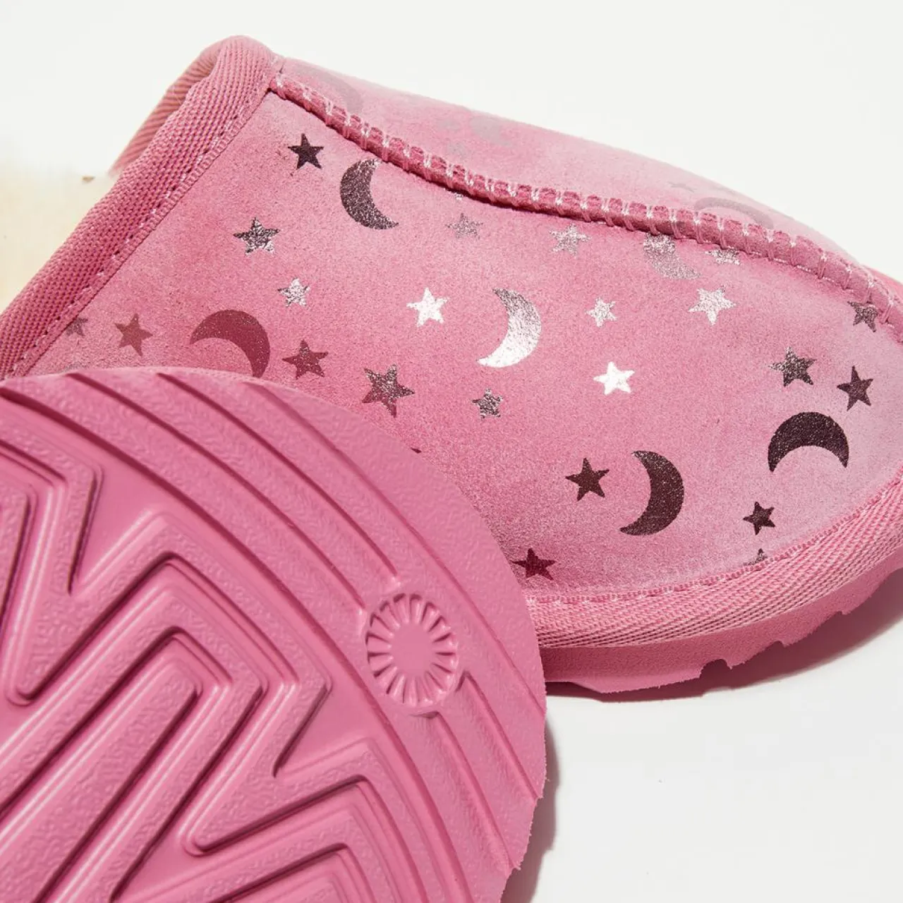 Allez-y doucement avec la pantoufle Keegan. Une chaussure à enfiler confortable pour enfants avec du daim à imprimé étoiles métallisé doublé de notre mélange de laine upcyclée UGGplush™, elle est dotée d’une semelle coussinée Treadlite by UGG™ qui voyage aussi bien à l’intérieur qu’à l’extérieur.