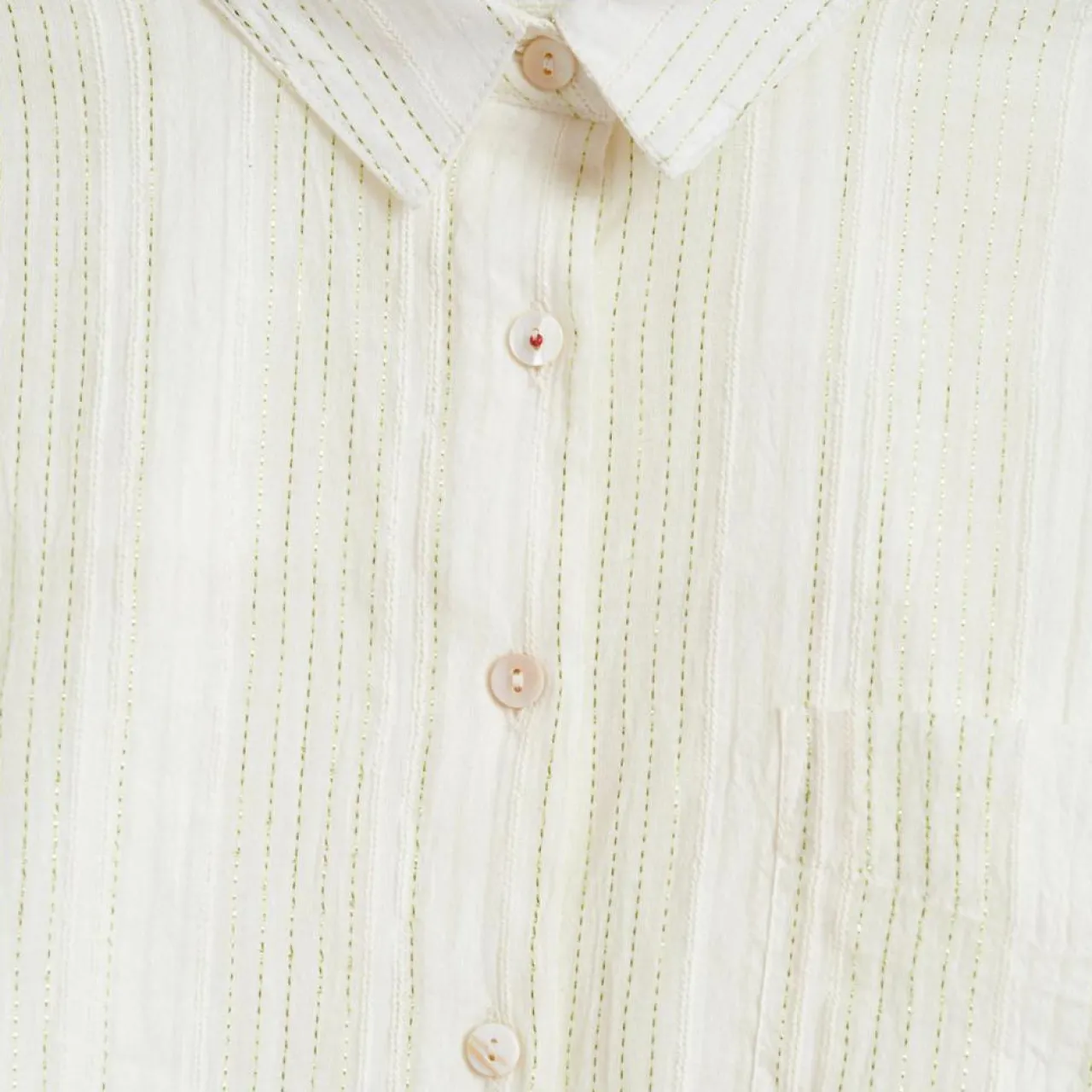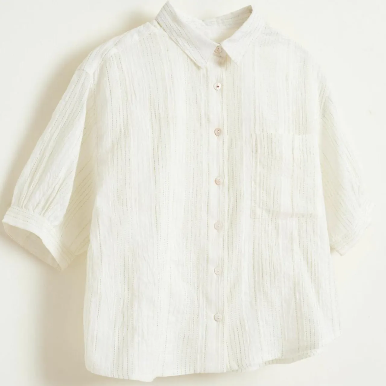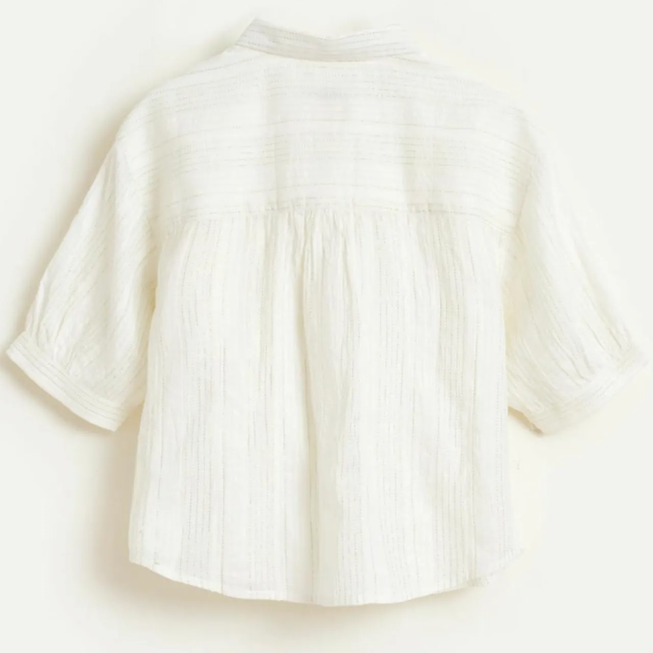Quelques plis discrets qui donnent un peu de volume aux manches et un coton aux fines rayures lurex qui apportera une touche brillante à son look