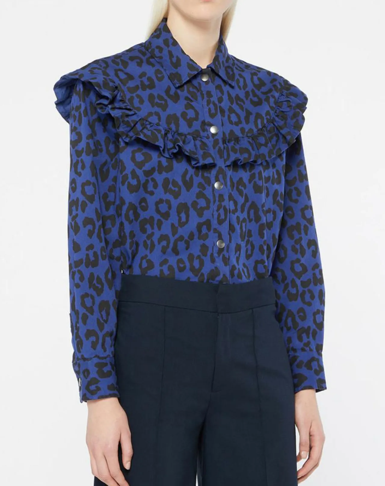 Cette chemise droite Galeries Lafayette en coton bio à imprimé léopard, est munie d’un col classique, de manches longues, d’une fermeture par boutons pression ainsi que d’un volant sur la poitrine.