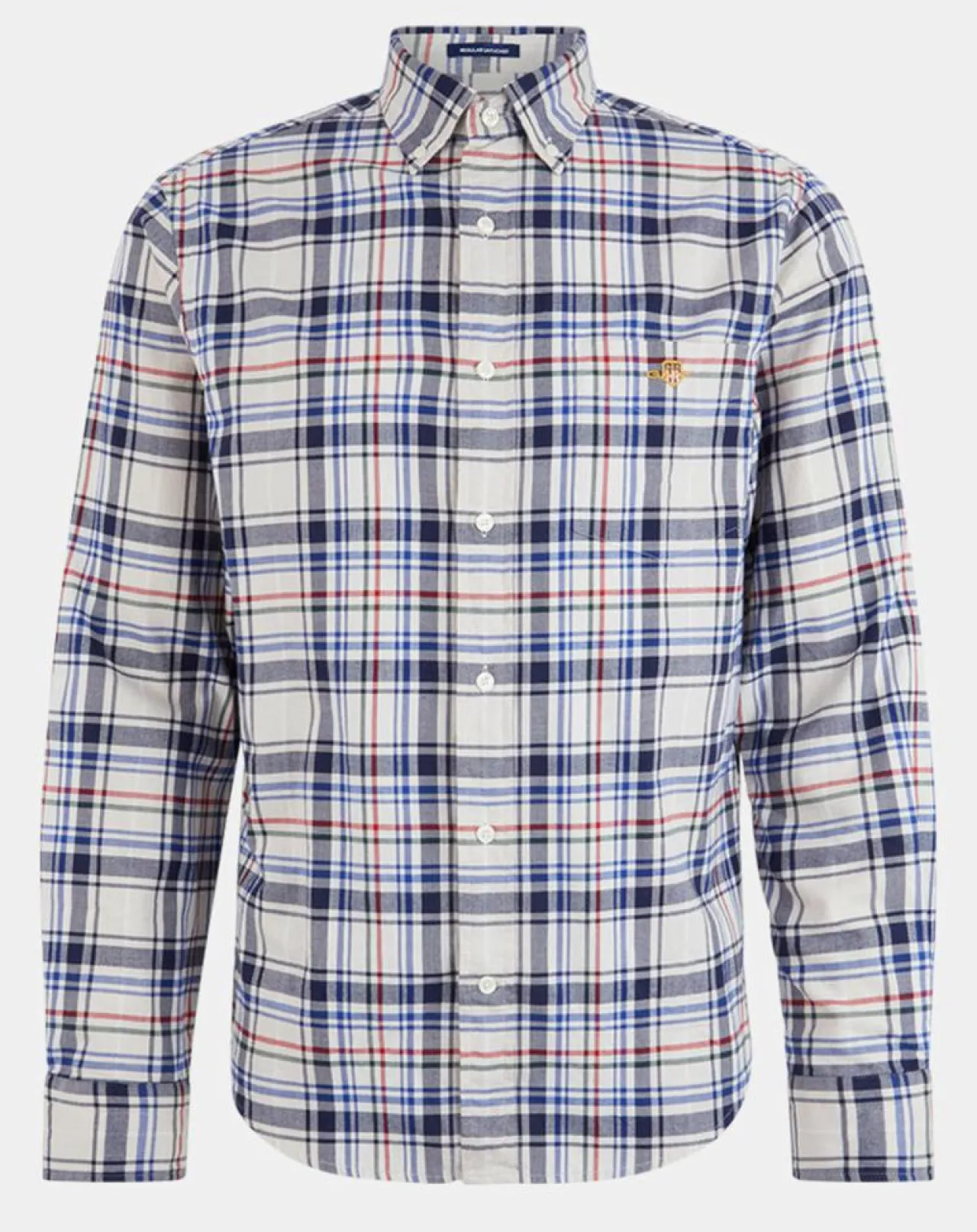 Cette chemise droite Gant en coton twill présente un imprimé tartan, un col américain, une fermeture boutonnée, une poche plate poitrine ornée du logo et de la signature ainsi que des poignets ronds 1 bouton ajustable