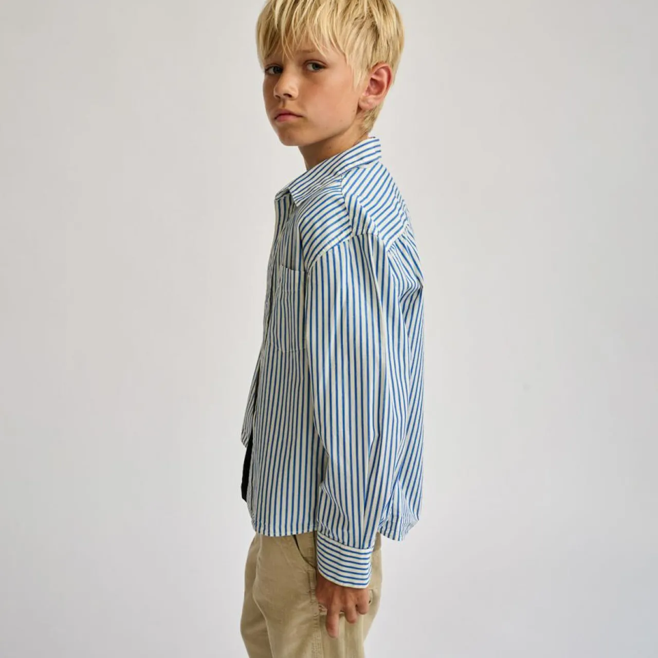 Elle est confectionnée dans une popeline de coton craquante avec un imprimé rayures verticales qui lui donne un côté plus moderne