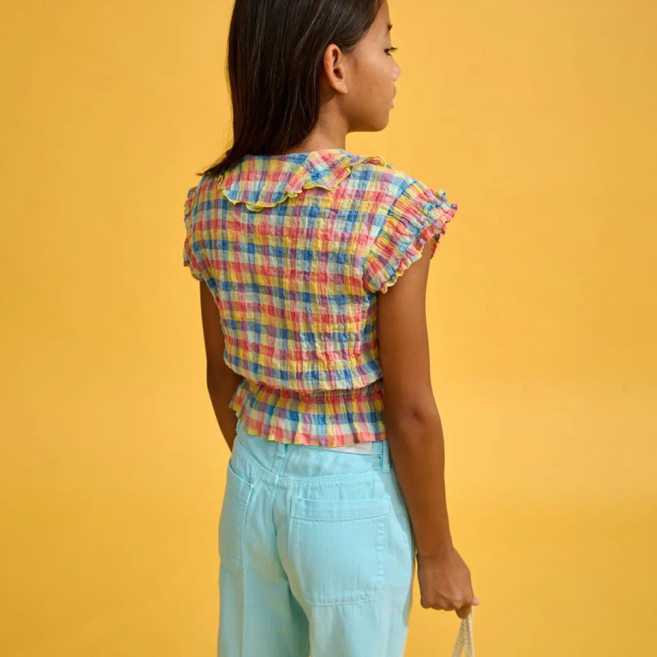 Prête à swinguer ? Le top POOKER est un délice de volants et de carreaux multicolores d’inspiration madras