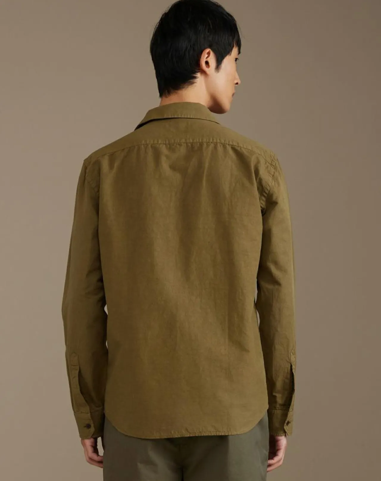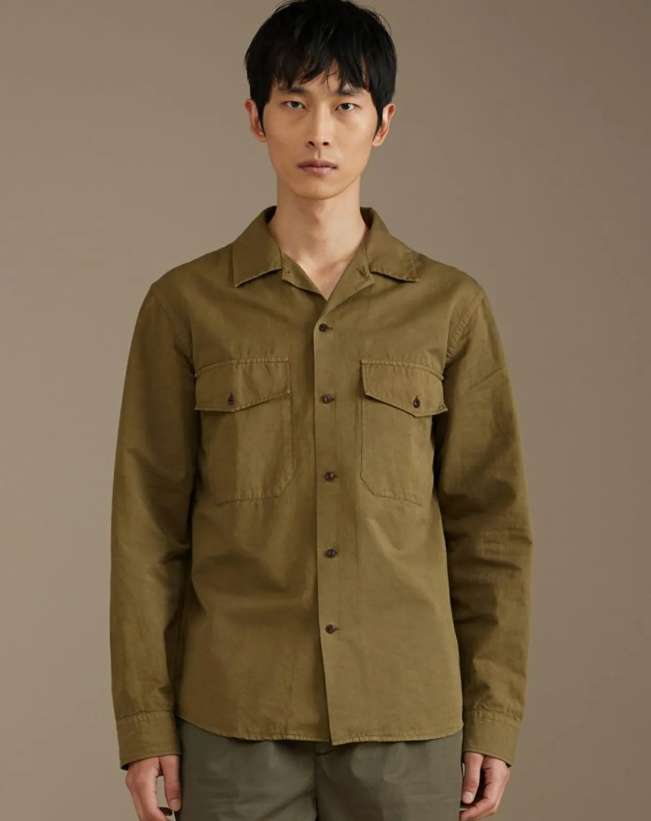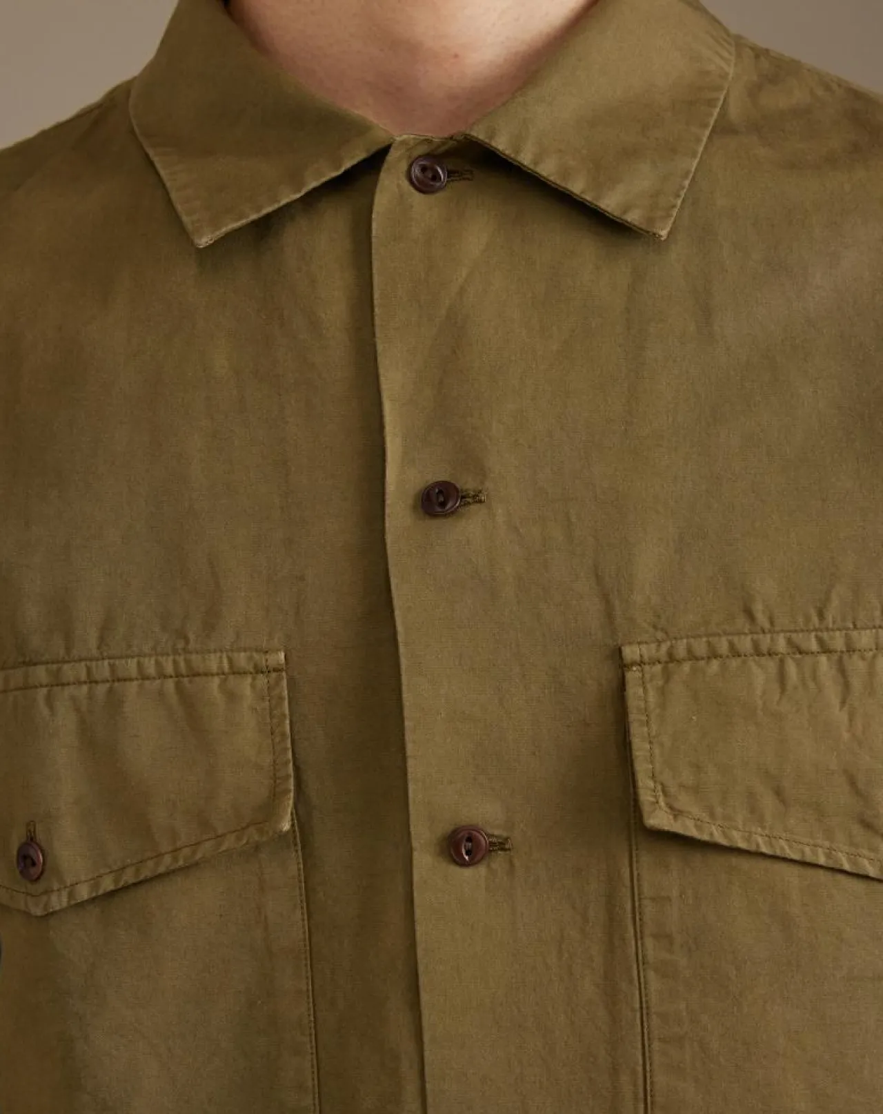 Elle est confectionnée en sergé de coton biologique et lin mélangés dont l’effet satiné donne du cachet à son kaki militaire