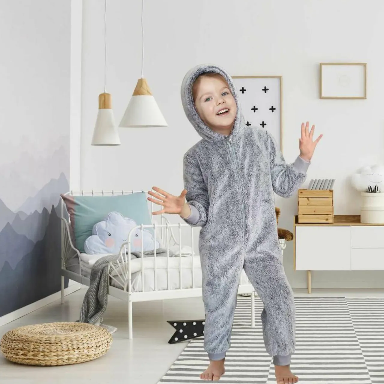 Cette jolie combinaison en sherpa gris est confortable et douce