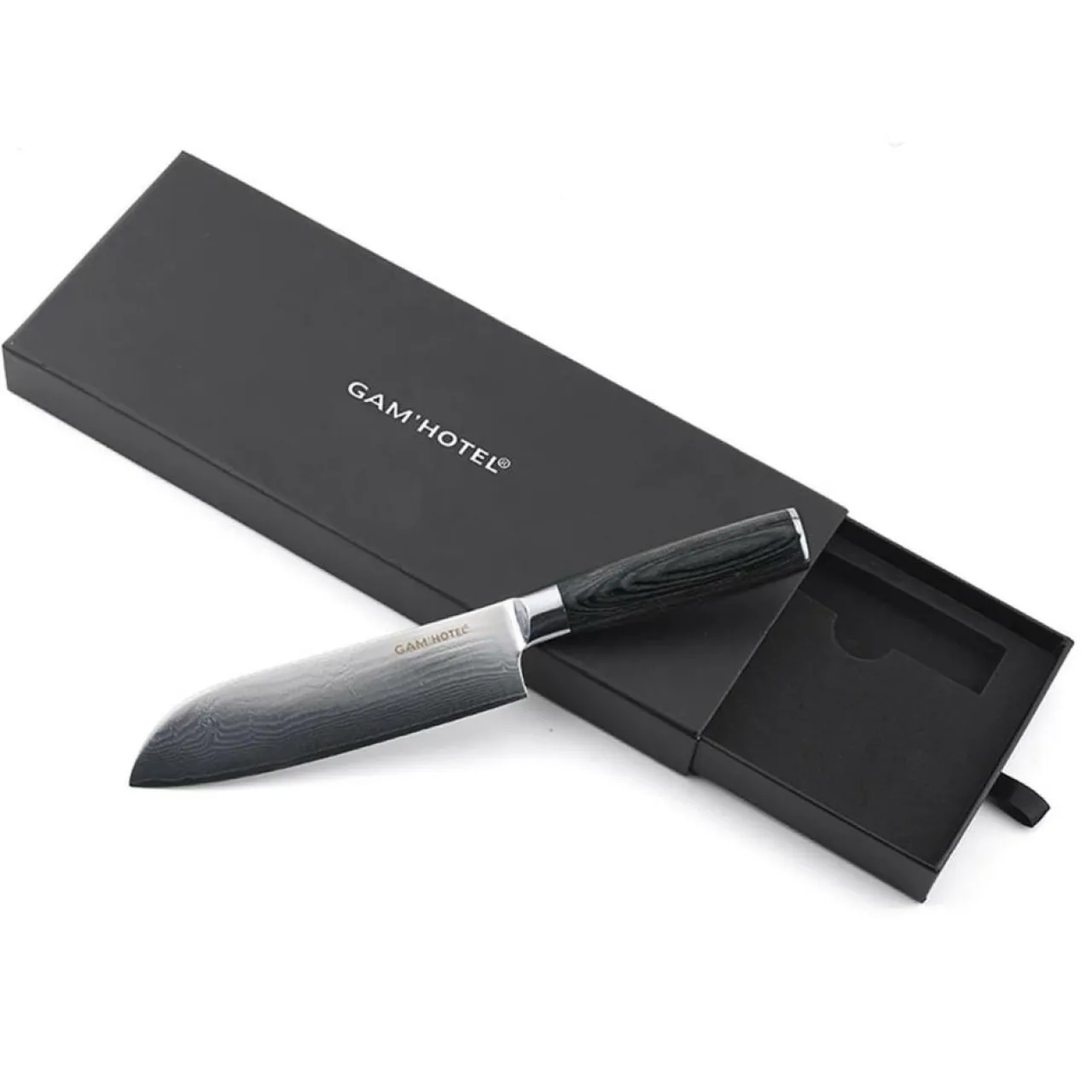 Sa lame en acier damas est composée de 67 couches superposées sur un coeur en acier 10CR14MOV à 1.1% de carbone