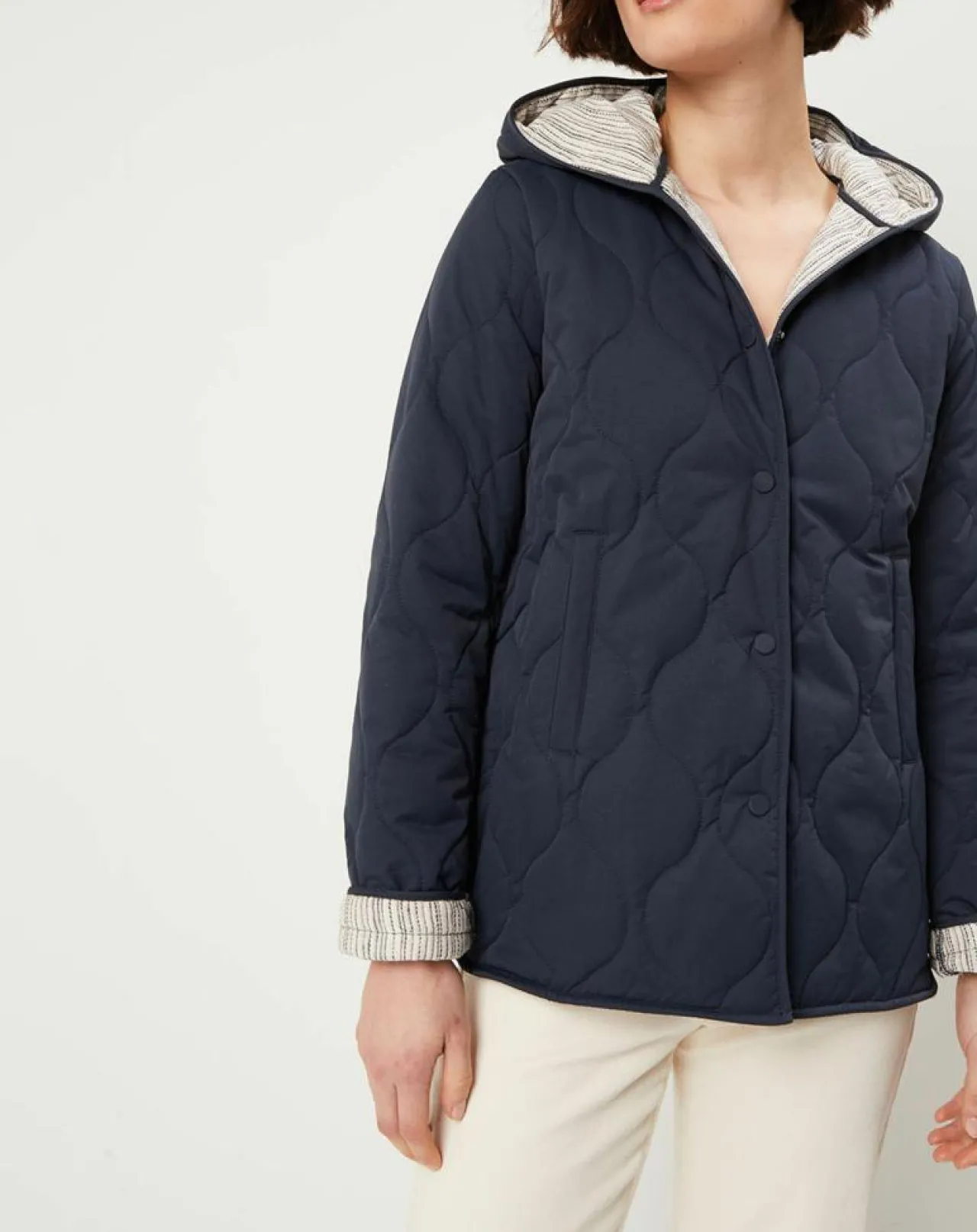 Elle respecte l’environnement, et sublime votre garde-robe avec son coloris passe partout et ses détails de doublure à rayure et de matelassage en petites vagues, ses détails féminins feront toute la différence