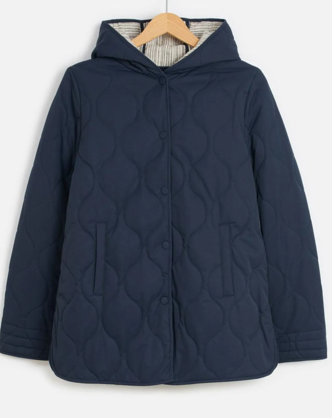 Une doudoune matelassée en fibres recyclées dans un bleu marine, et entièrement doublée