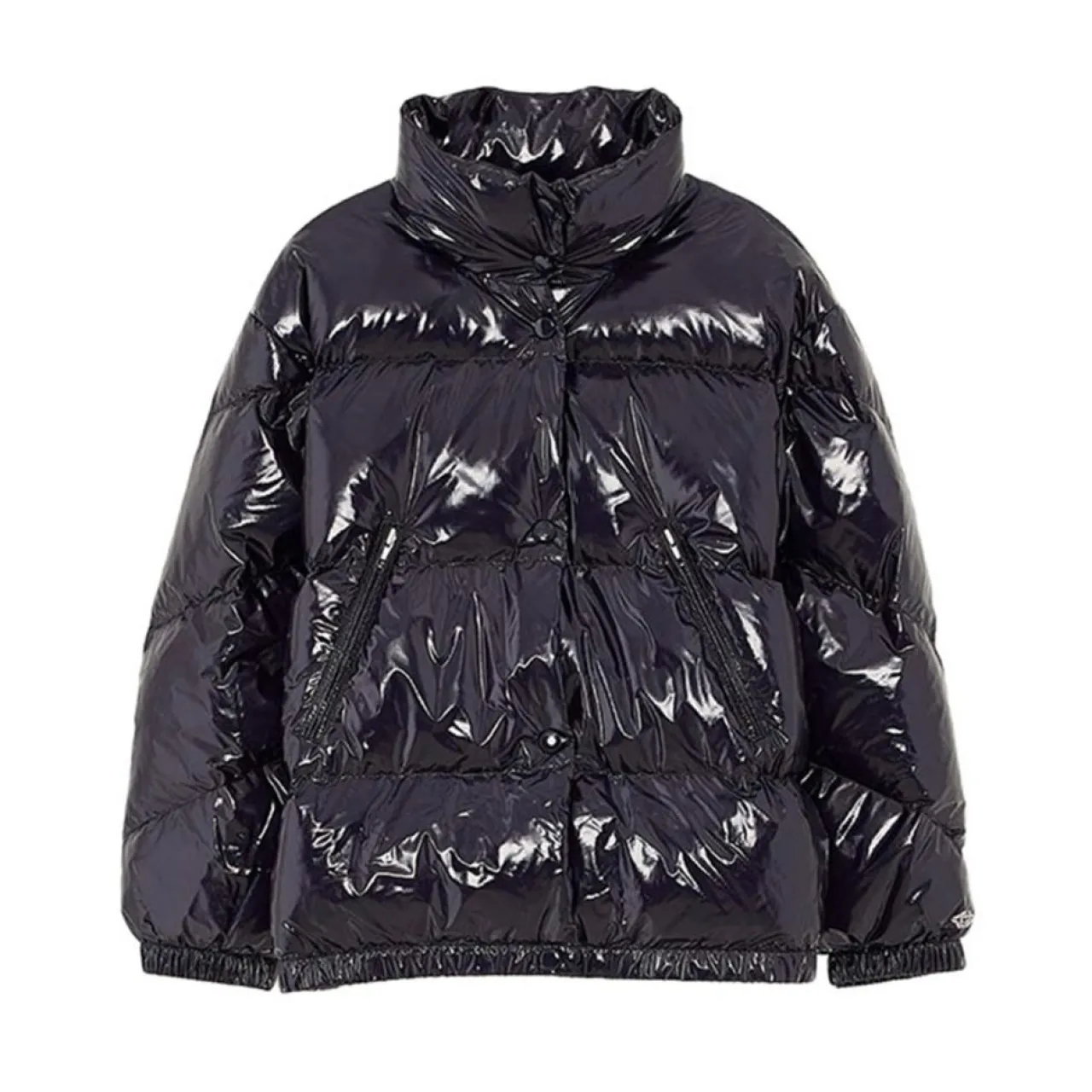 Doudoune bleue avec zip avant et boutons-pression dans le bas permettant d’ajuster la longueur d’une coupe classique à une coupe courte