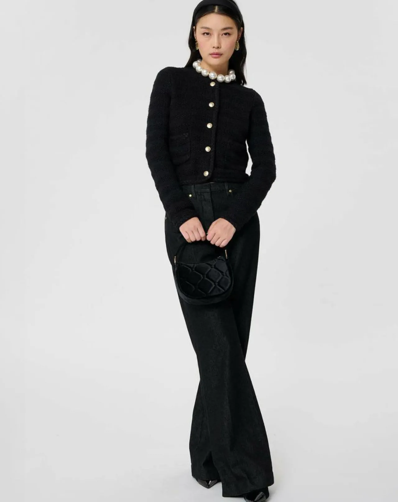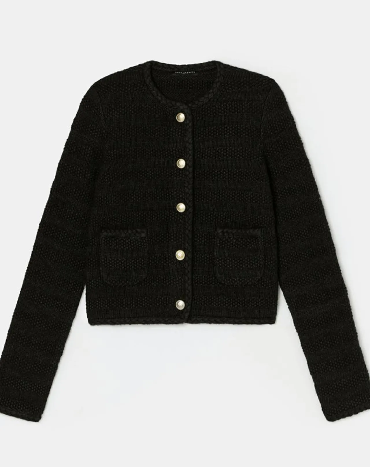 Ce gilet bleu nuit en laine et coton possède des manches longues, une encolure ronde et des poches au-devant