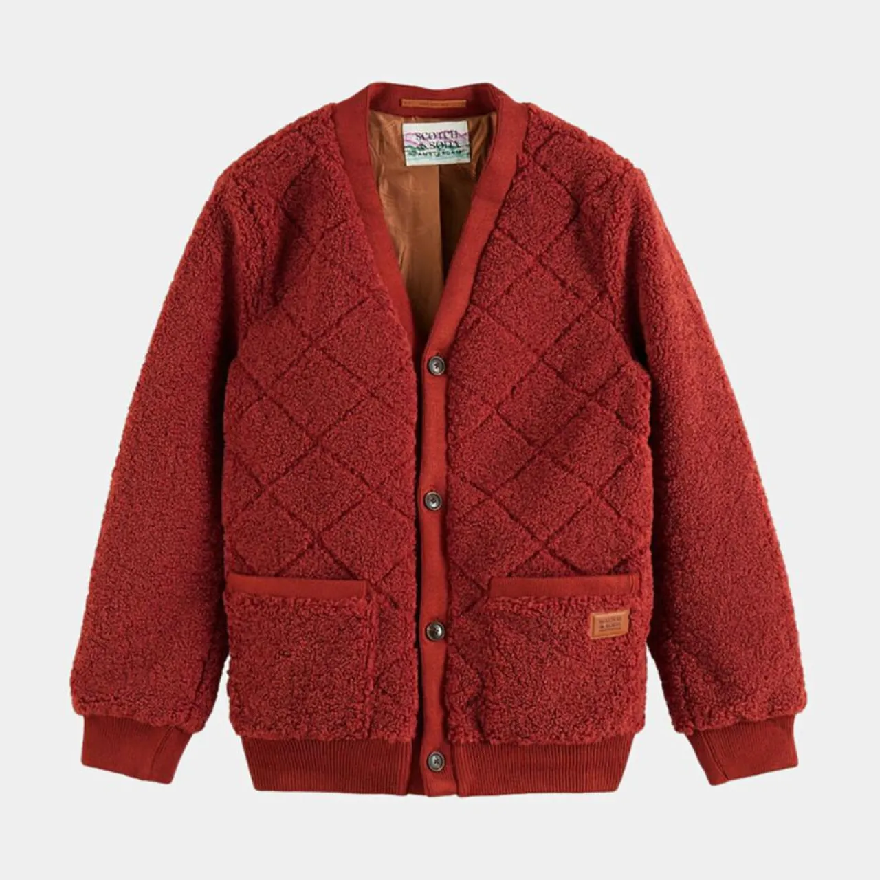 Ce gilet court droit Scotch & Soda façon sherpa à surpiqûres losanges ton sur ton, est muni d’un col V, de manches longues, d’une fermeture boutonnée, de 2 poches plaquées sur l’avant, de finitions côtelées et d’une doublure