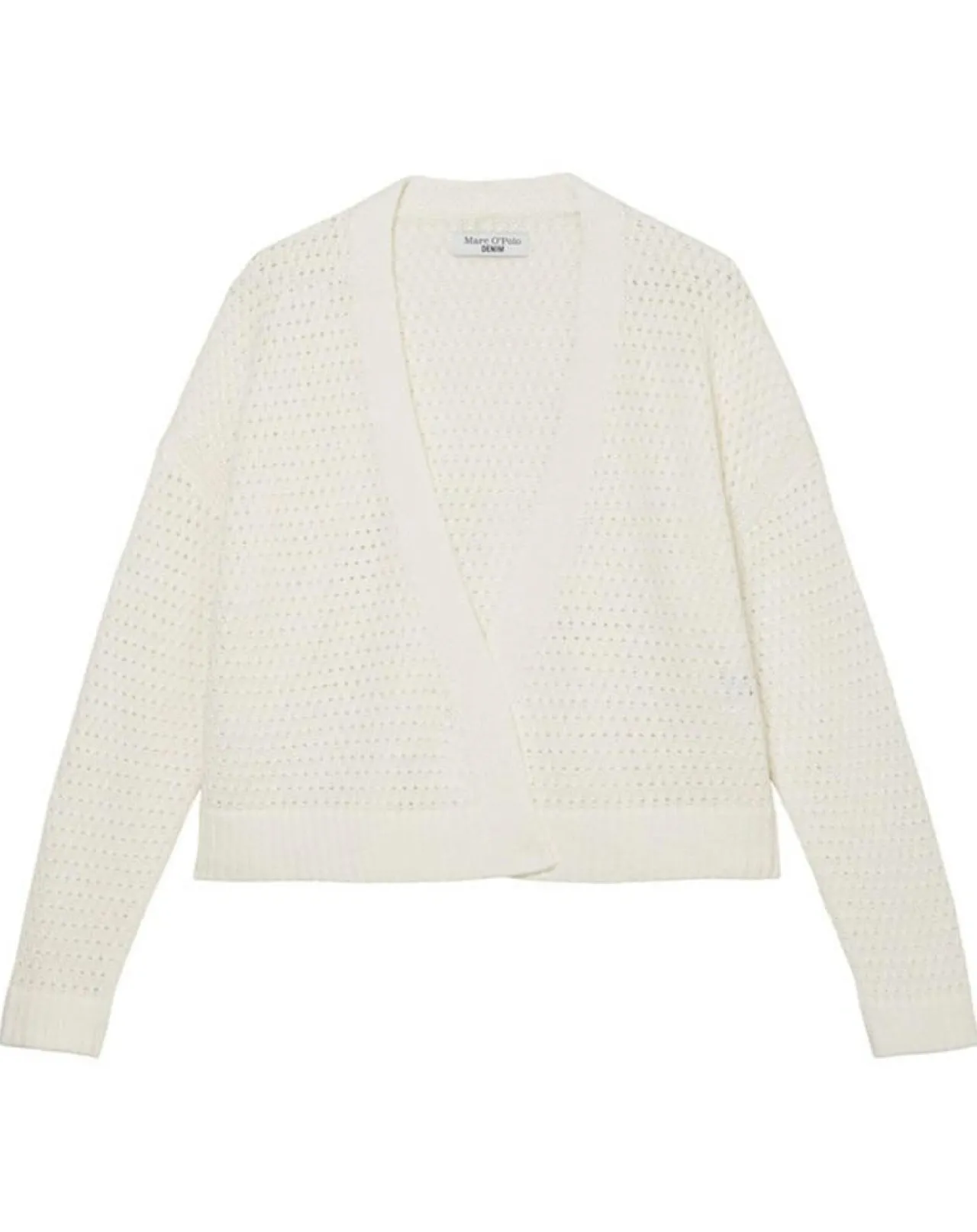 Modèle favori absolu pour la mi-saison : le petit cardigan décontracté à texture filet vaporeuse.