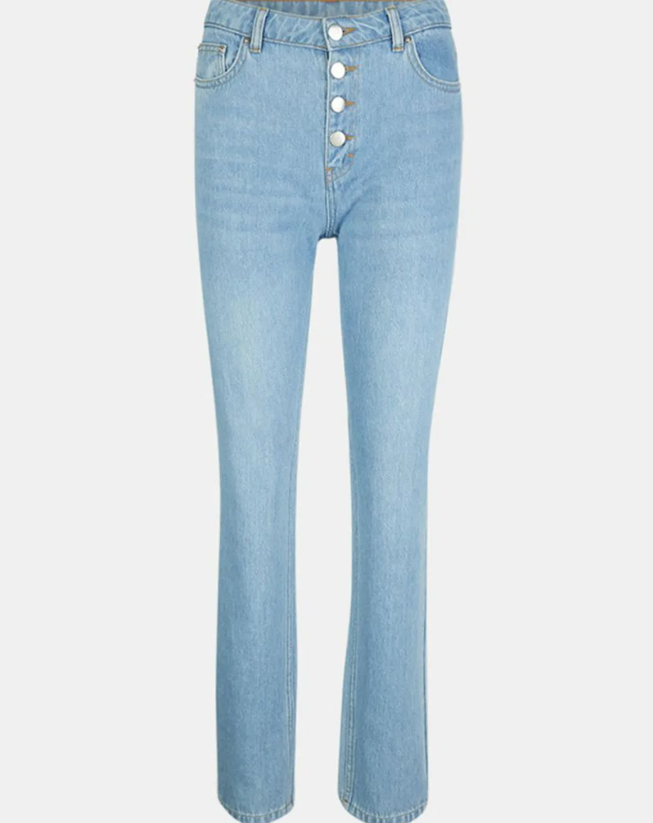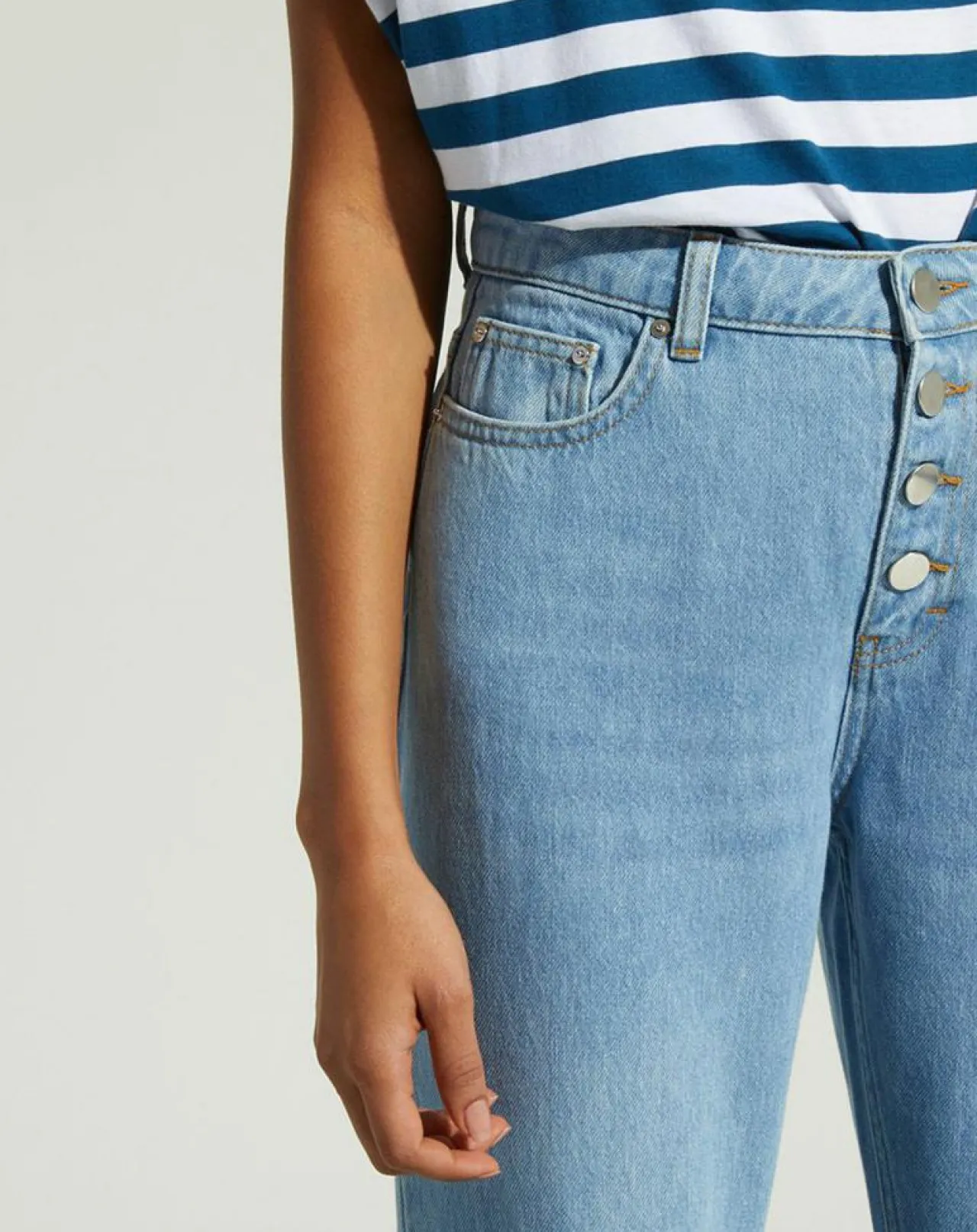 Ce jean droit Galeries Lafayette en coton biologique délavé est muni de 3 poches sur l’avant, de 2 poches sur l’arrière, d’une fermeture boutonnée, ainsi que d’une taille haute à passants.