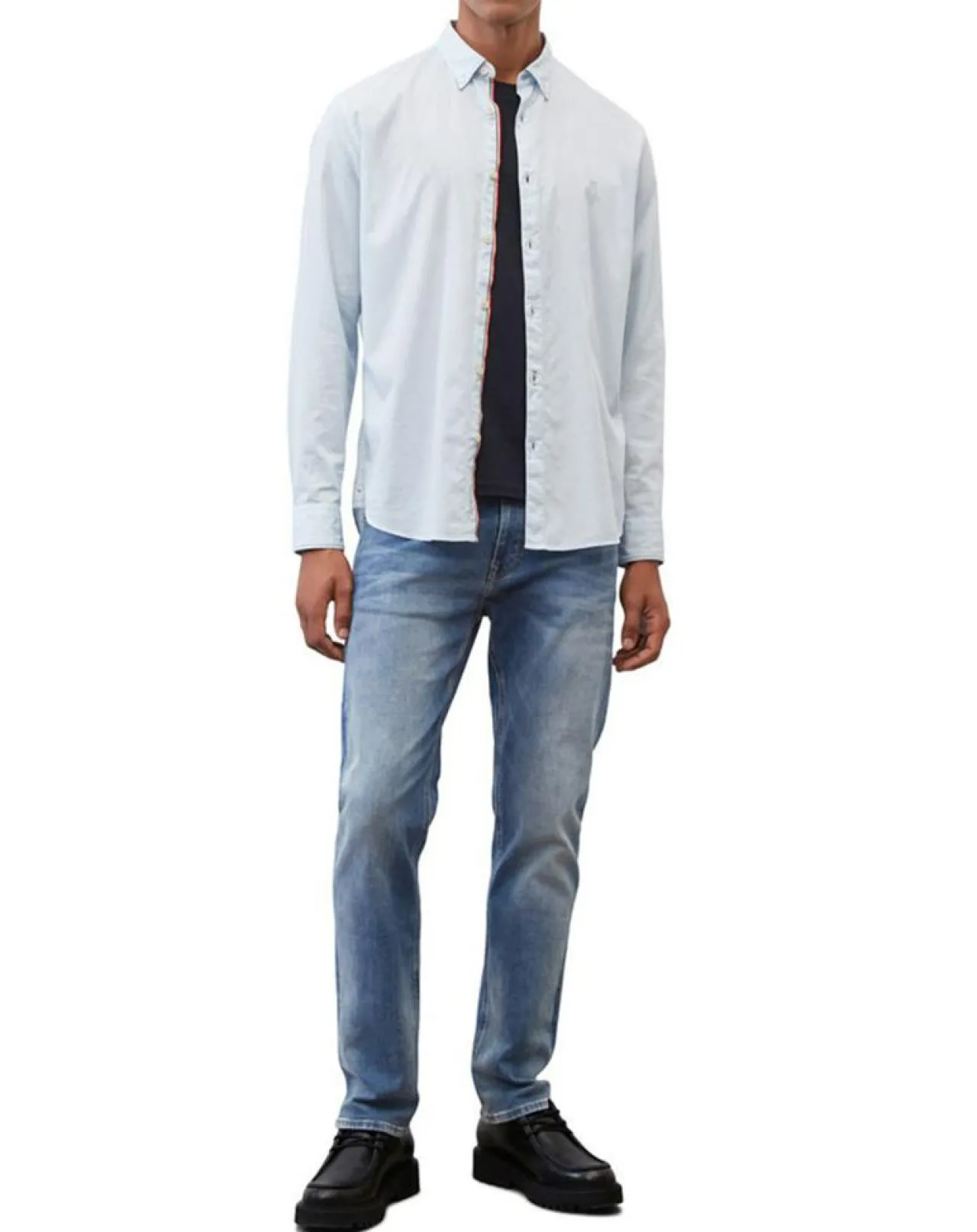 Jean – modèle KEMI – en coton mélangé haut de gamme, animé de plis permanents du déjà porté au look décontracté et d’un délavage bleu moyen très cool.