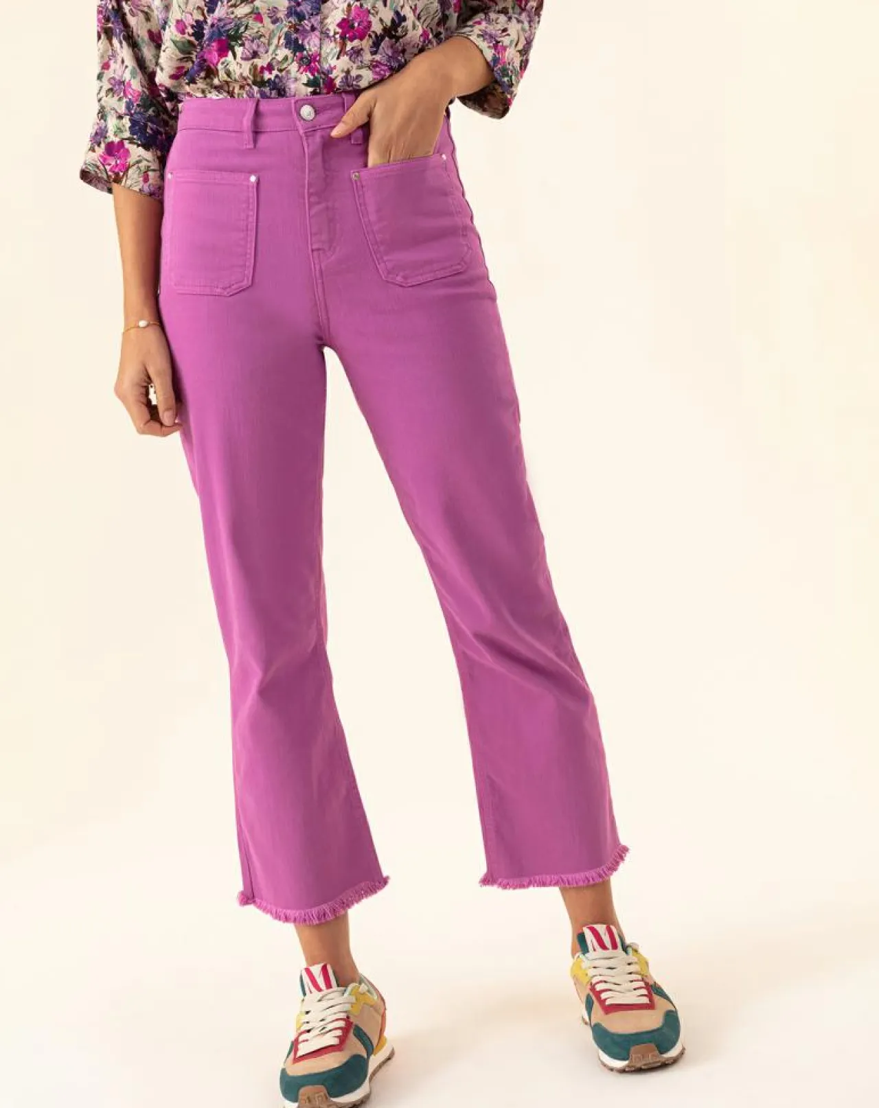 le détail des petites franges en bas du jean ajoute une touche de style bohème et tendance, tout en restant subtil et facile à porter