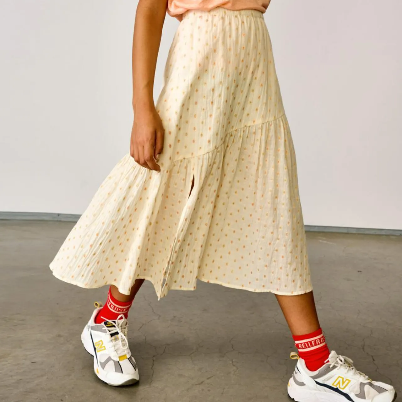 Coupée dans un coton jacquard à motif de petits soleils dorés, avec un volant asymétrique et une grande fente sur le devant pour mettre en valeur ses gambettes