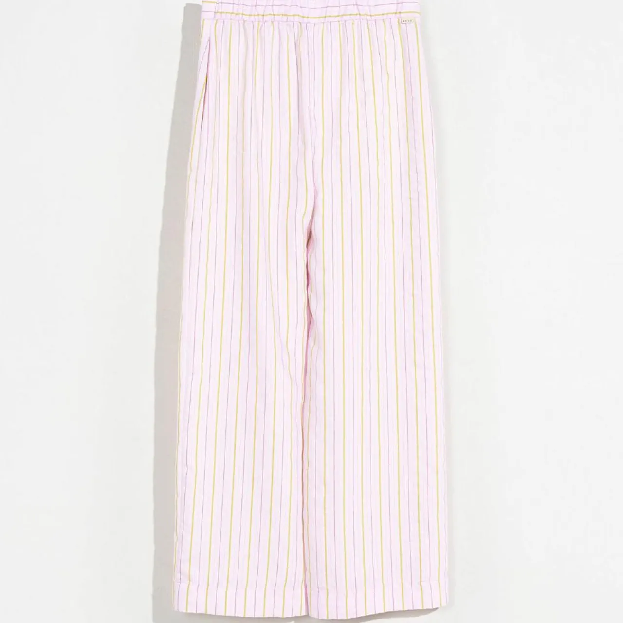 Confectionné en viscose mélangée avec des rayures estivales, le pantalon PAIGE présente un style épuré à jambes larges avec une taille élastique