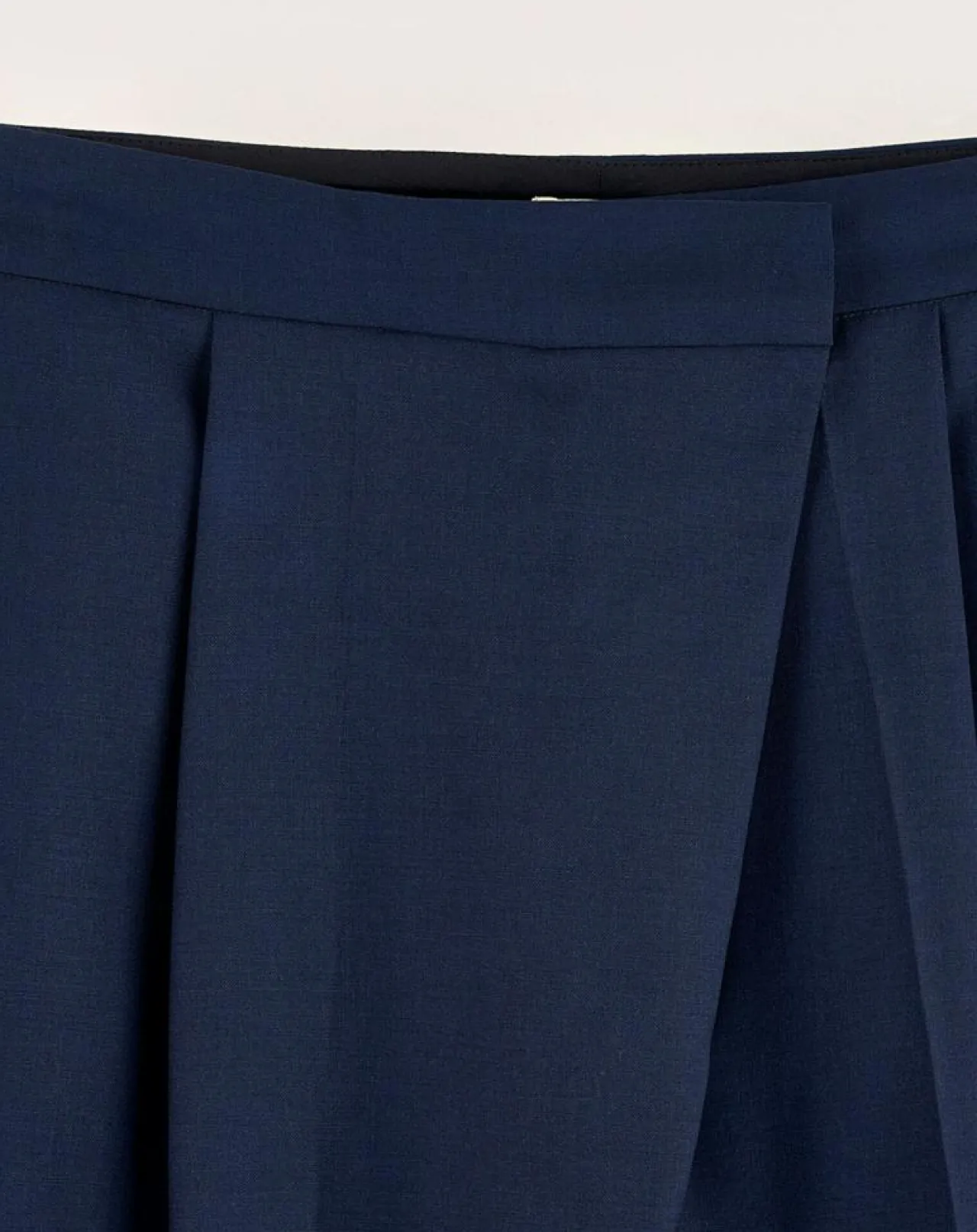 Pantalon de tailleur en laine bleu marine, taille haute avec avant drapé et croisé et jambes droites
