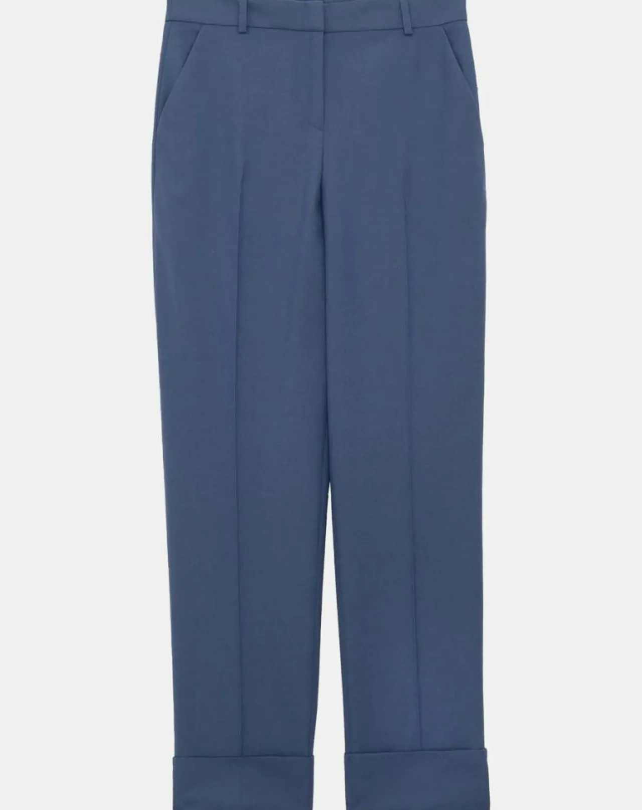 Basique de la garde robe, ce pantalon de tailleur bleu en laine froide possède une coupe courte soulignée d’un large revers, une taille mi-haute et des plis plats