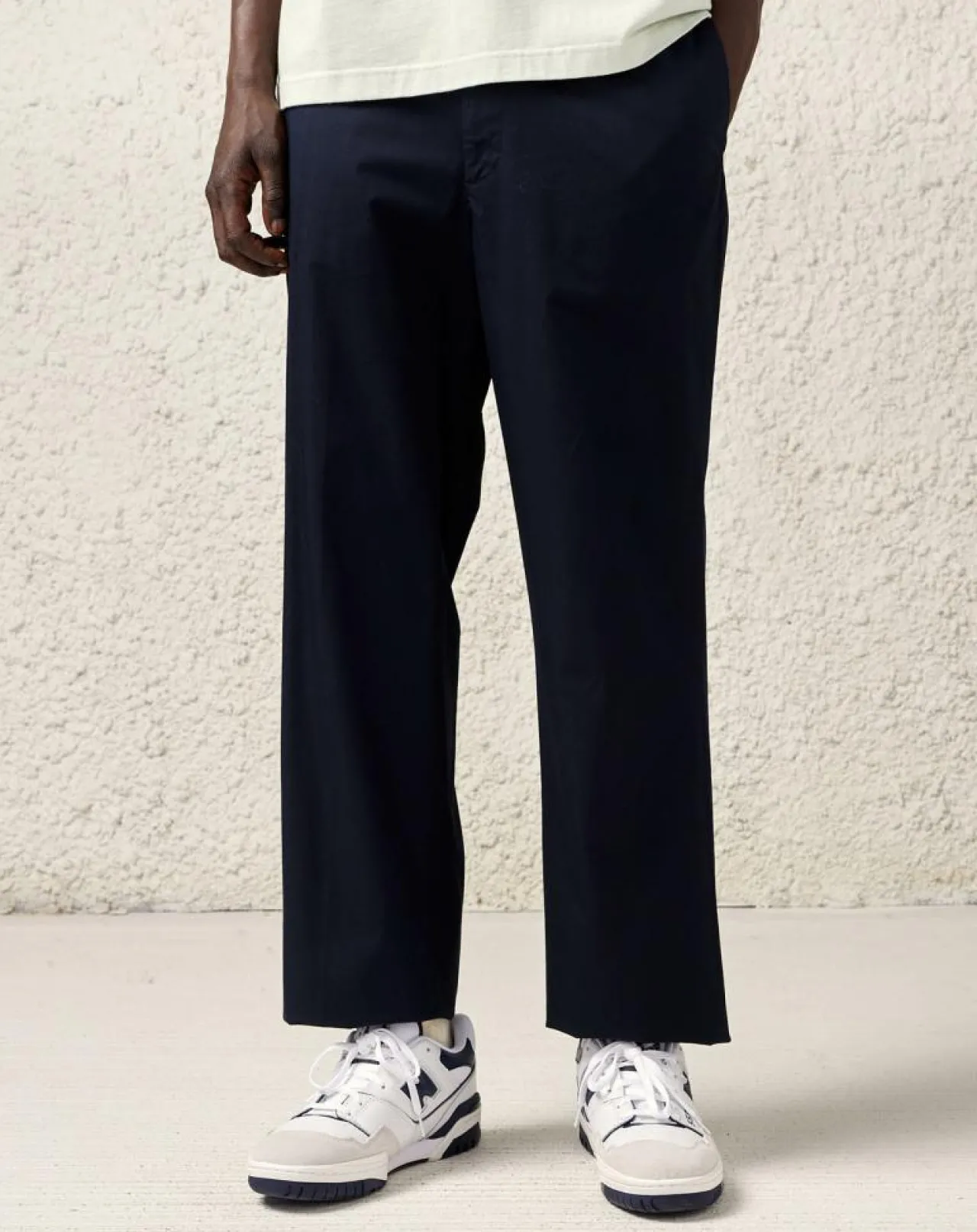 Fabriqués en pur coton italien, ils présentent une taille haute et de longues jambes larges qui viennent se casser sur le devant des chaussures juste comme il faut