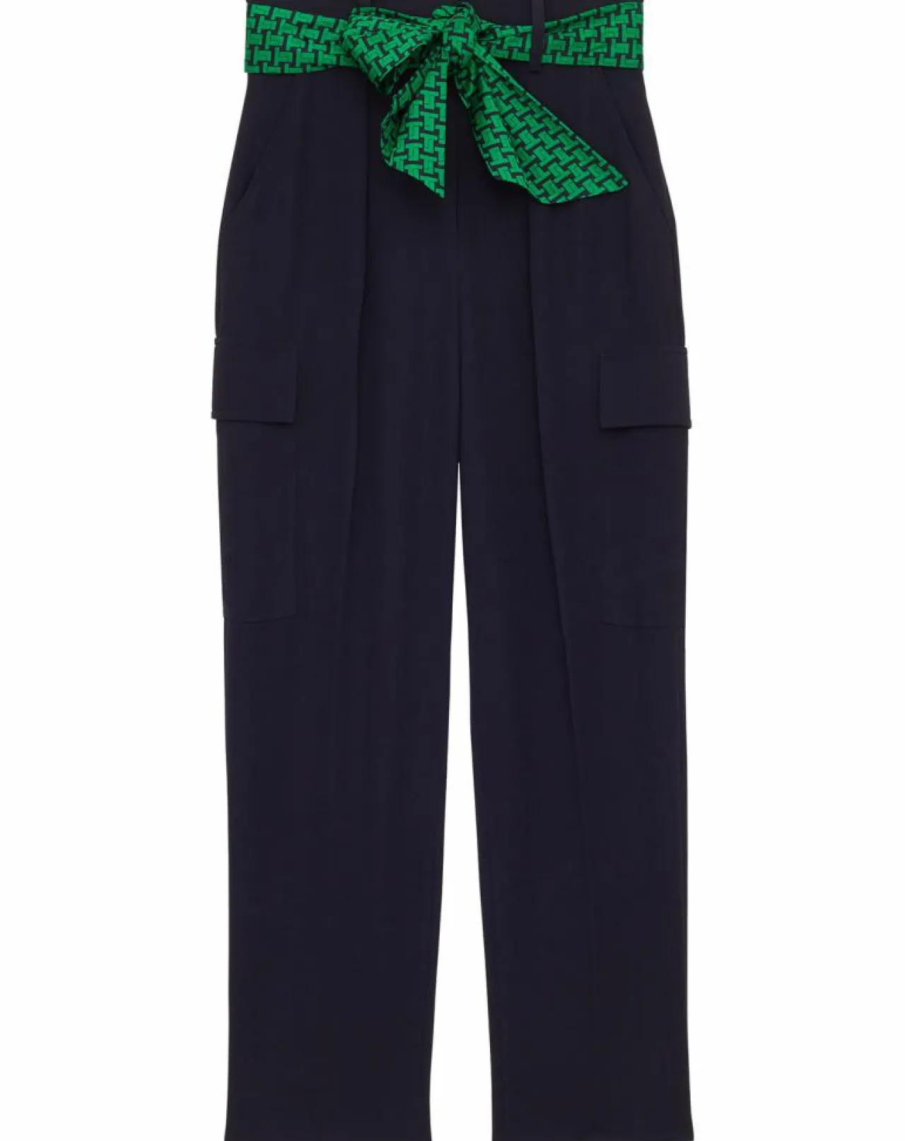 Ce pantalon bleu nuit en crêpe possède une coupe ajustée et une ceinture foulard amovible contrastée imprimée du nouveau monogramme de la maison Tara Jarmon