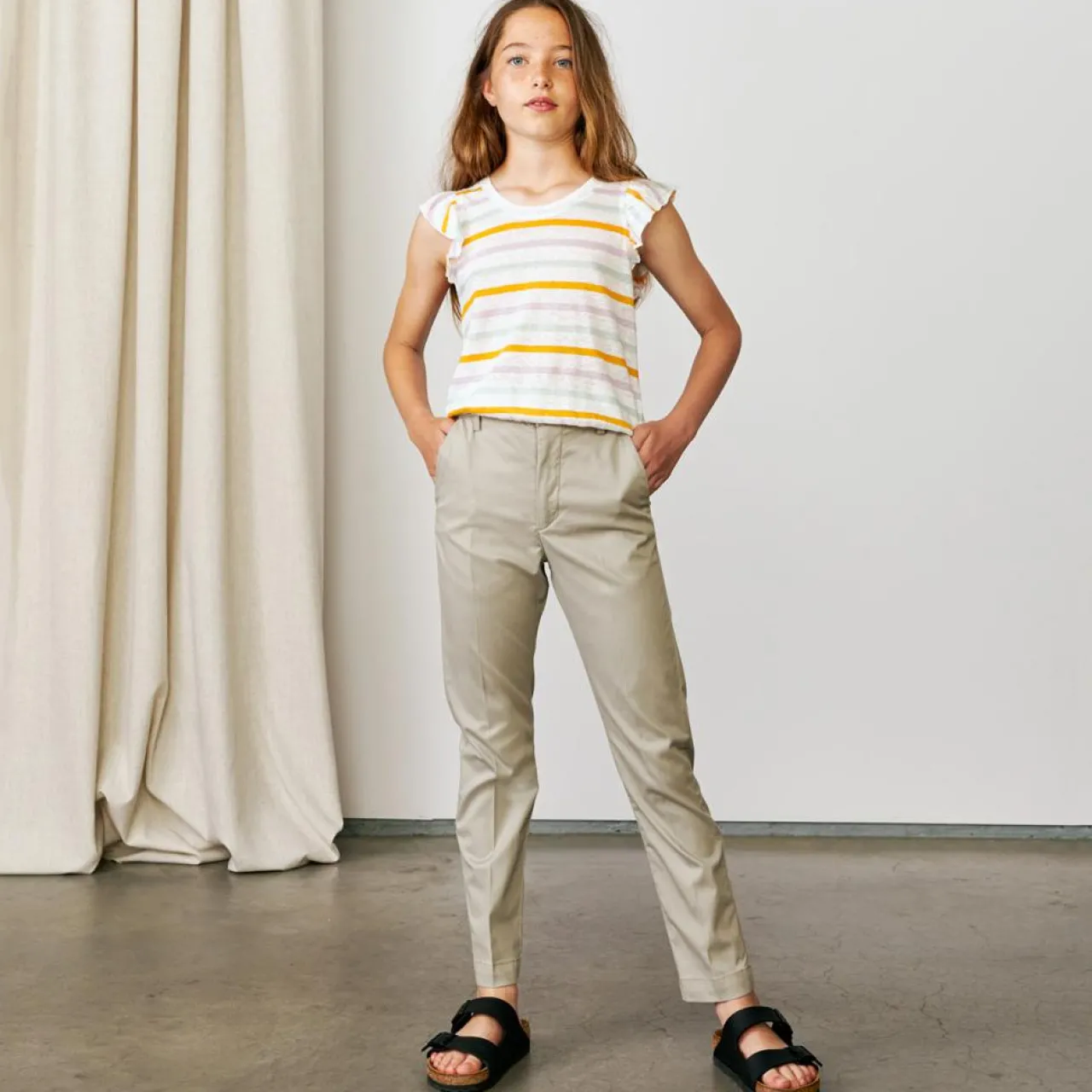 Taille haute, jambes affinées avec un pli avant et poches en biais pour un look travaillé, il est fabriqué dans un mélange léger et écologique de Lyocell et de coton, idéal pour les températures qui grimpent.