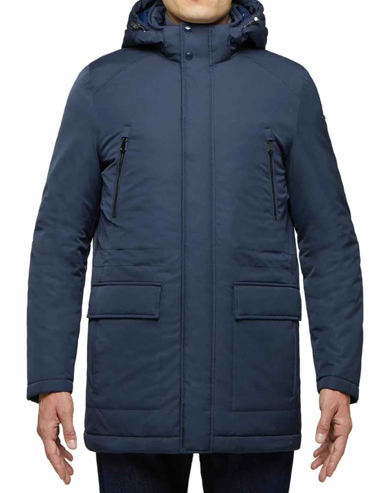 Dans cette version bleu nuit, le modèle Vincit est un manteau qui allie fonctionnalité et style formel, pour compléter au mieux les tenues de la ville et du bureau