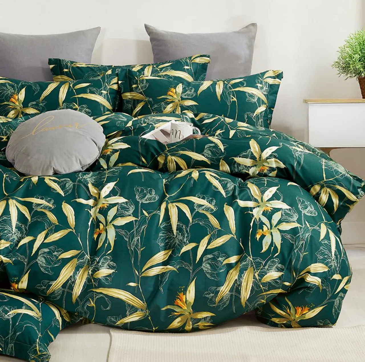 Plongez votre chambre dans une ambiance exotique et élégante avec la parure Bambusia, confectionnée en 100% percale de coton au tissage fin de 80 fils/cm². Son motif luxuriant de feuilles dorées et vert clair sur un fond vert profond crée une atmosphère chaleureuse, naturelle et raffinée.