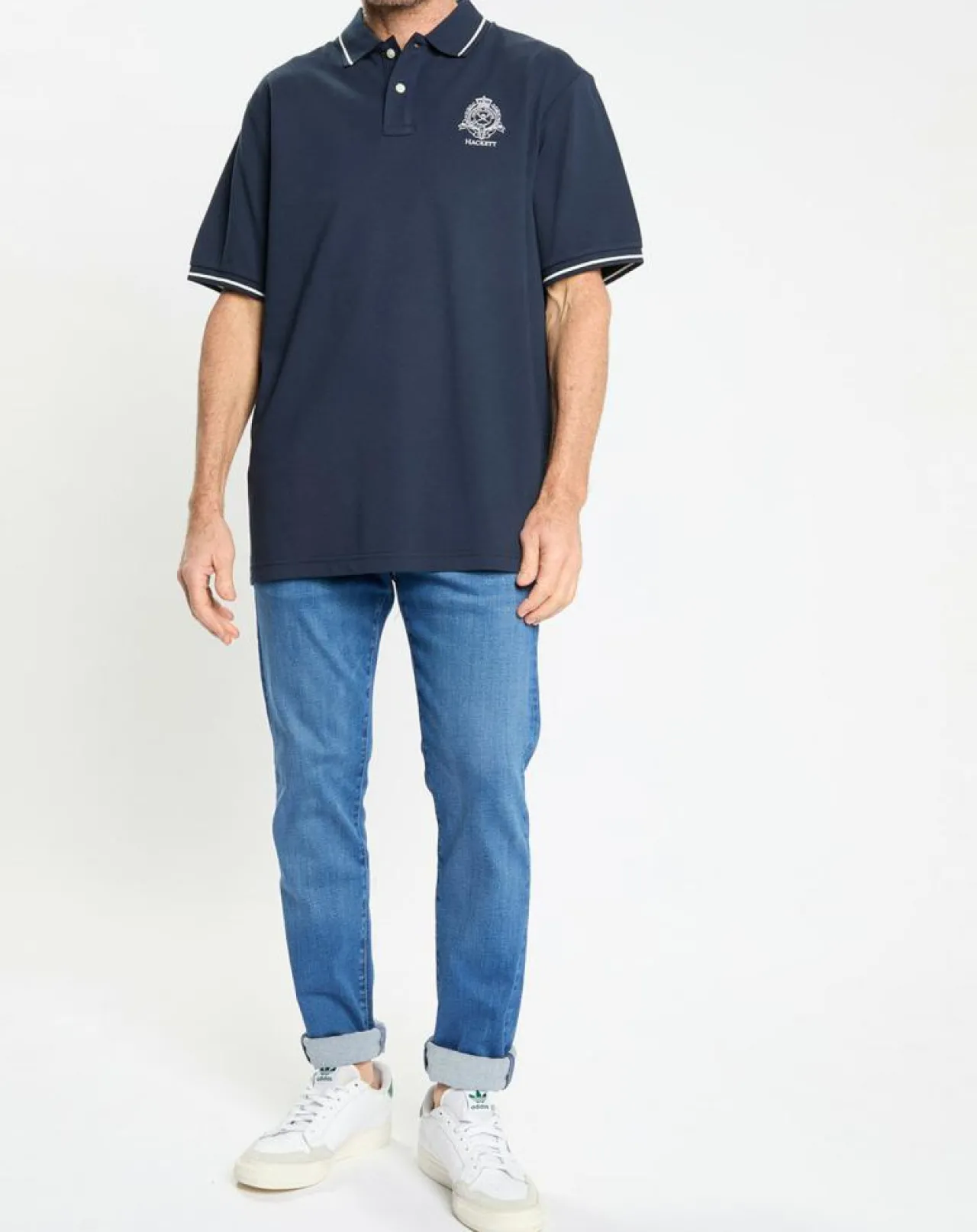 Ce polo droit Hackett London en coton piqué est muni d’un col classique suivi d’une patte à 2 boutons, de manches courtes, d’une broderie blason et signature sur le côté gauche de la poitrine ainsi que de finitions côtelées à liserés contrastants